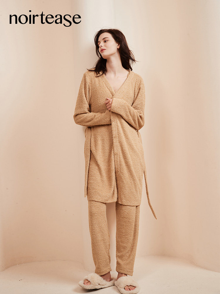 NoirTease秋冬加绒加厚睡衣女士保暖长袖系带睡袍家居服三件套装
