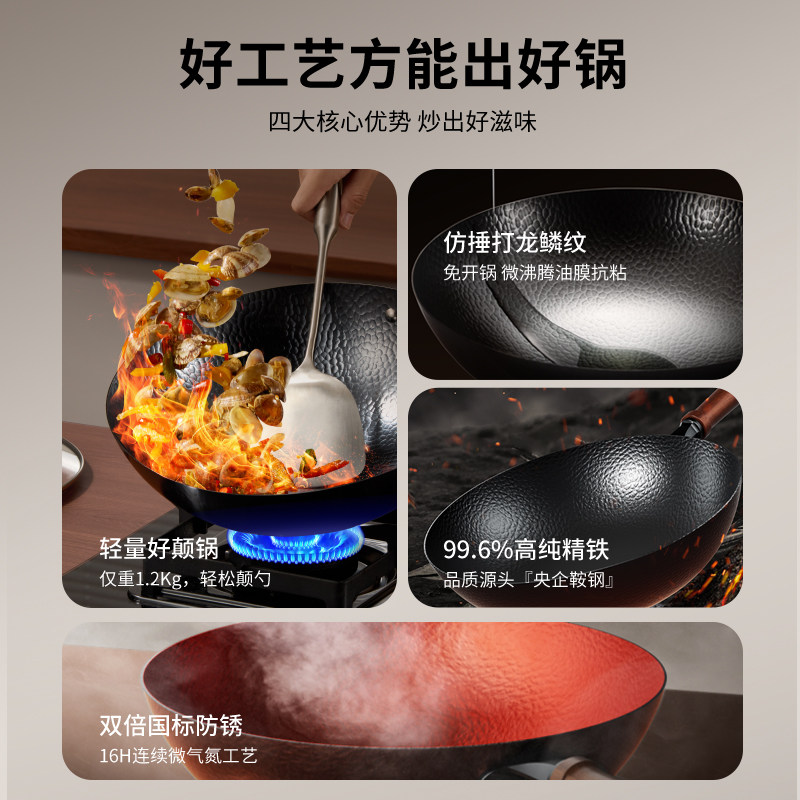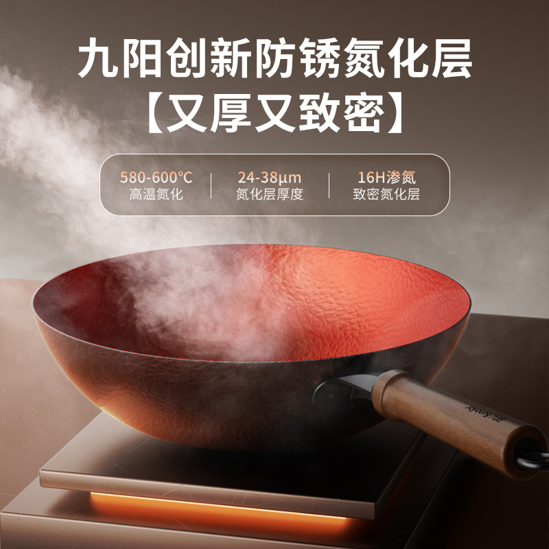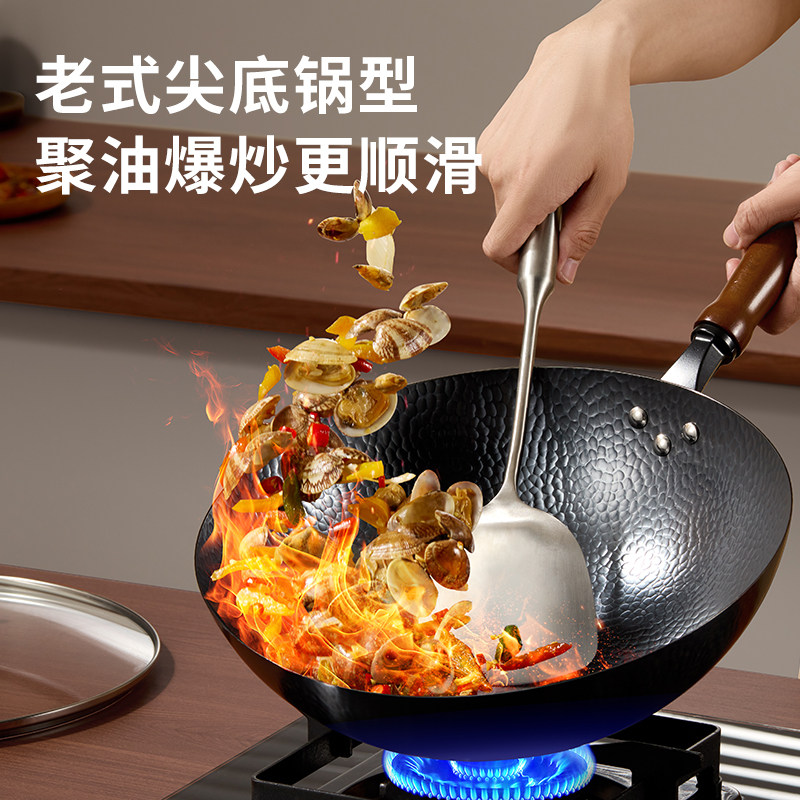 九阳铁锅炒菜锅家用炒锅老式锤纹燃气煤气灶专用无涂层防粘精铁锅