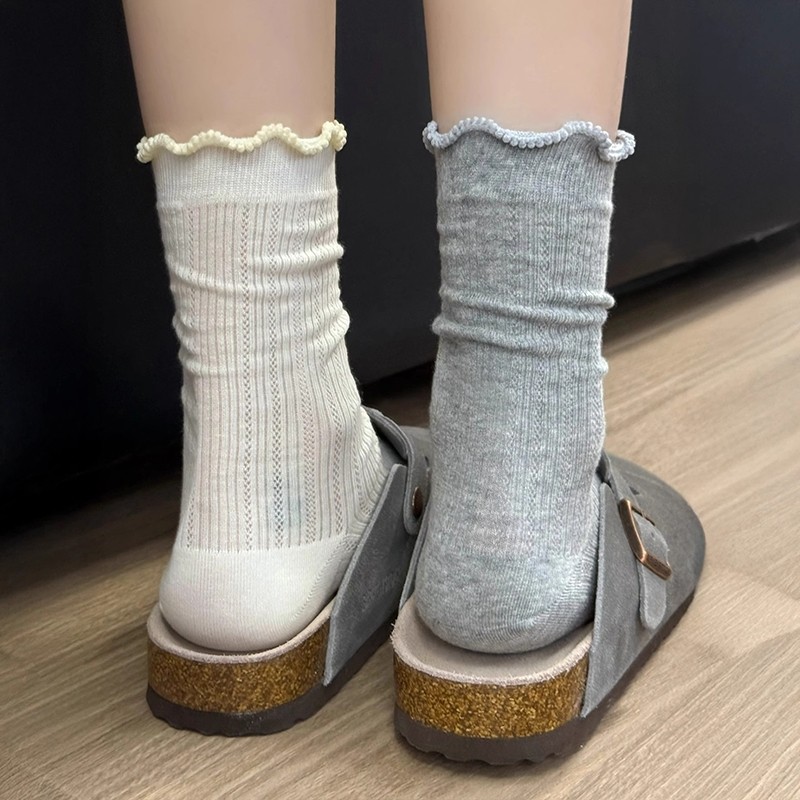 司童薄款芭蕾风花边袜子女春夏季中筒袜木耳灰色配长袜白色黑色