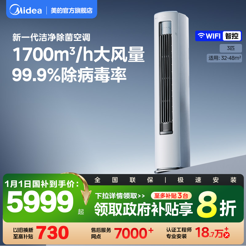 美的官方空调大2/3匹立式柜机新一级冷暖变频家用客厅正品静优风