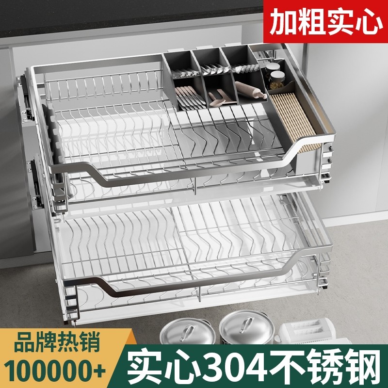 厨房304不锈钢缓冲轨抽屉式双层调料拉篮橱柜内置物收纳碗碟架蓝