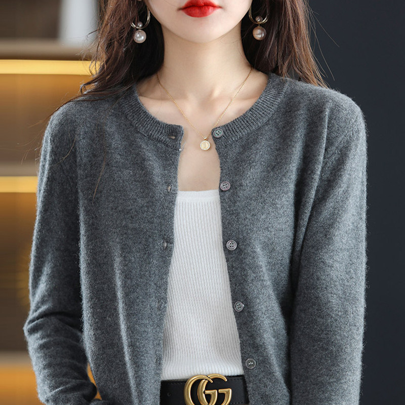 春秋薄款羊毛针织开衫女韩版圆领宽松短款羊绒衫外搭毛衣外套上衣