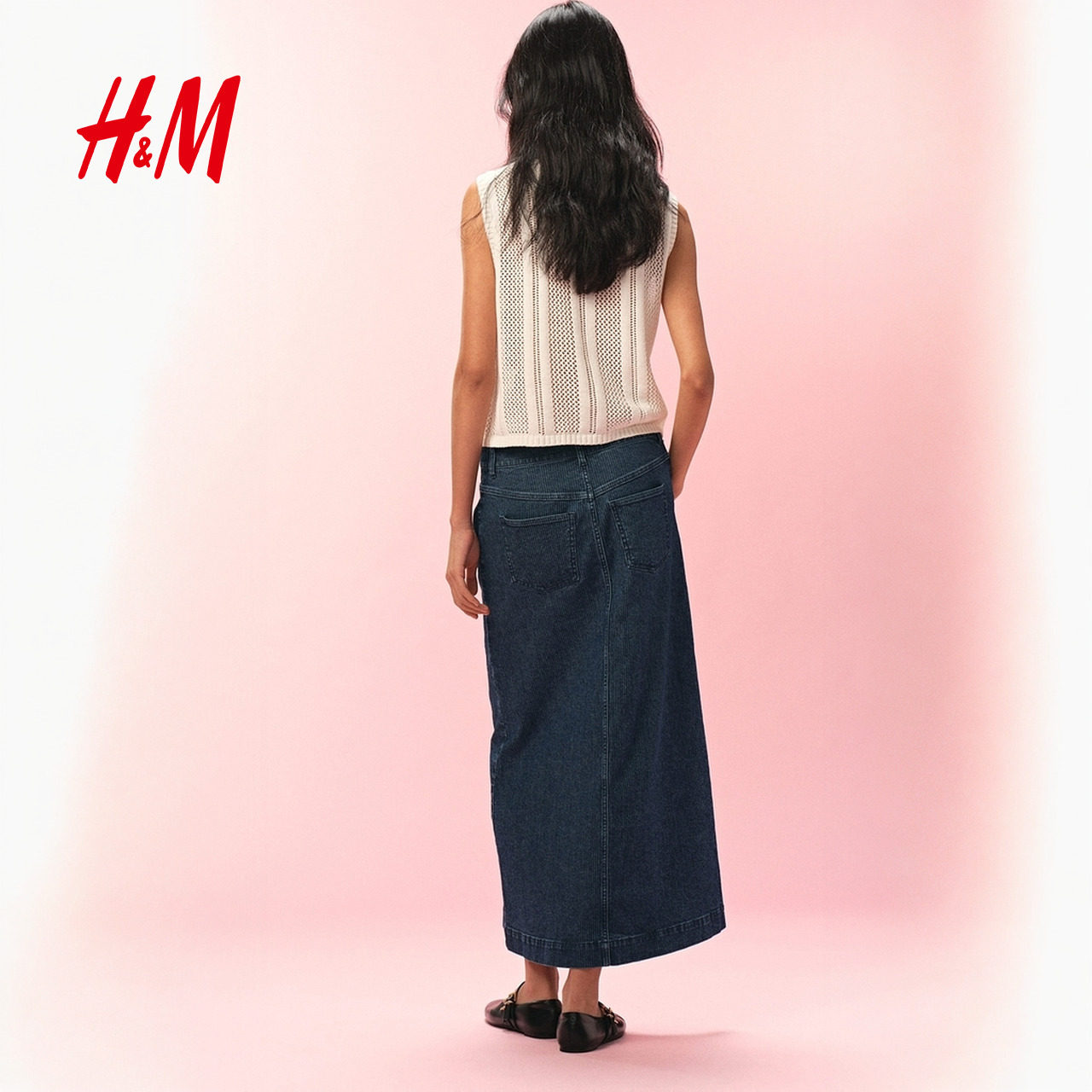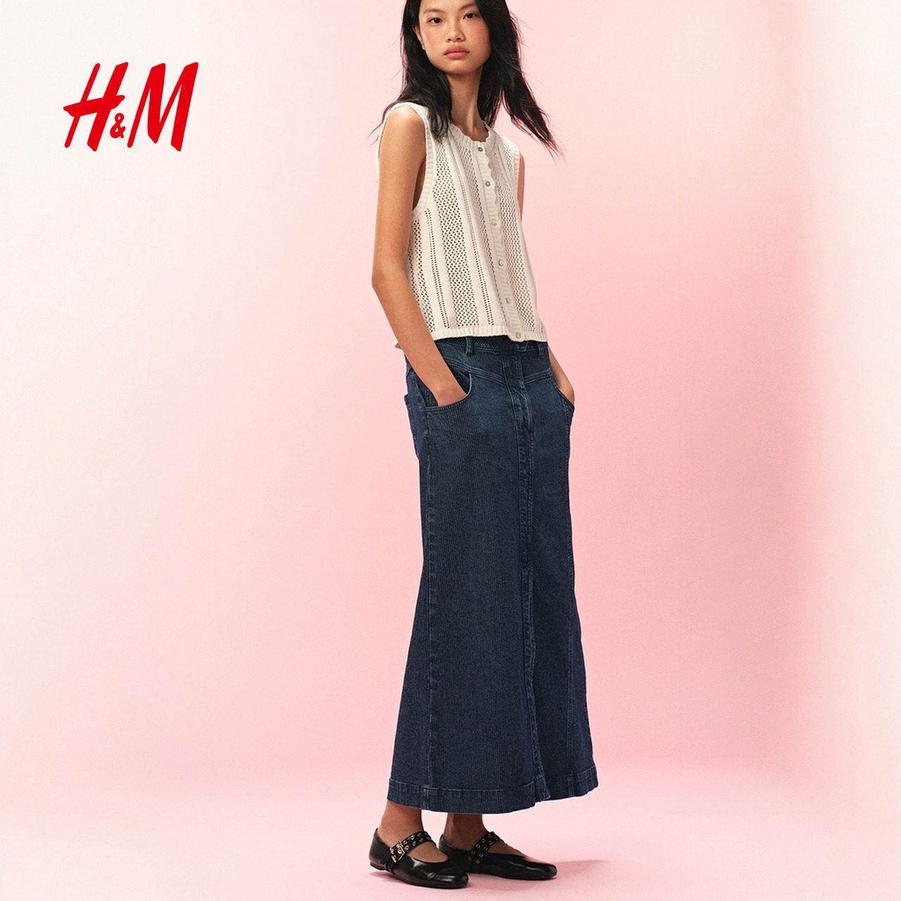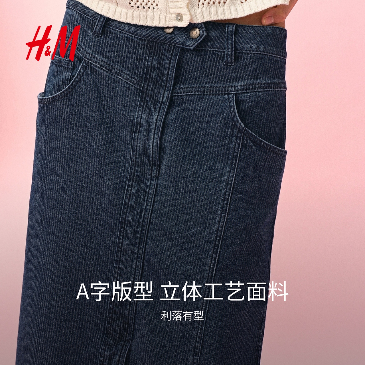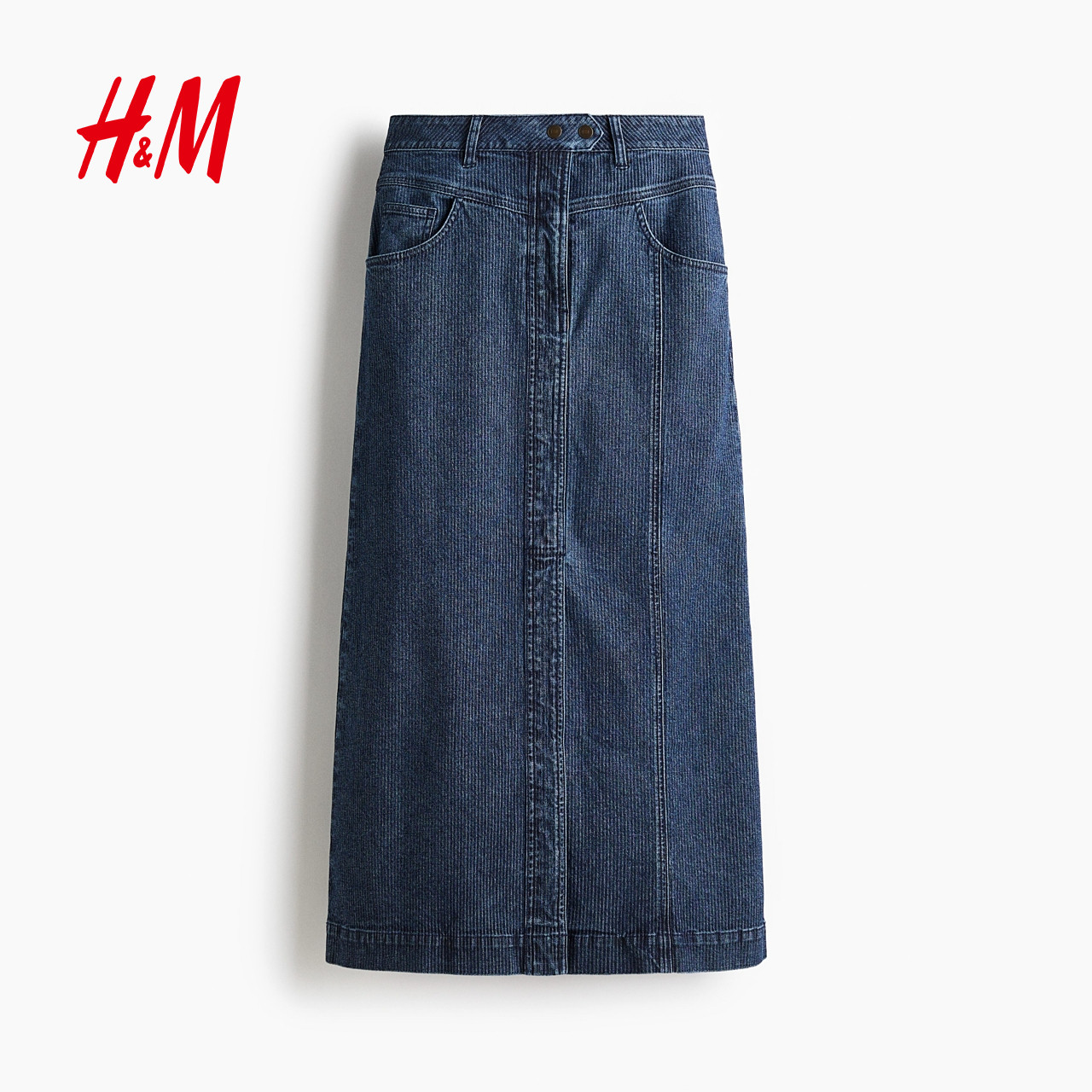 HM女装半身裙2025年秋季新款低腰直筒A字条纹牛仔开衩半裙1309754