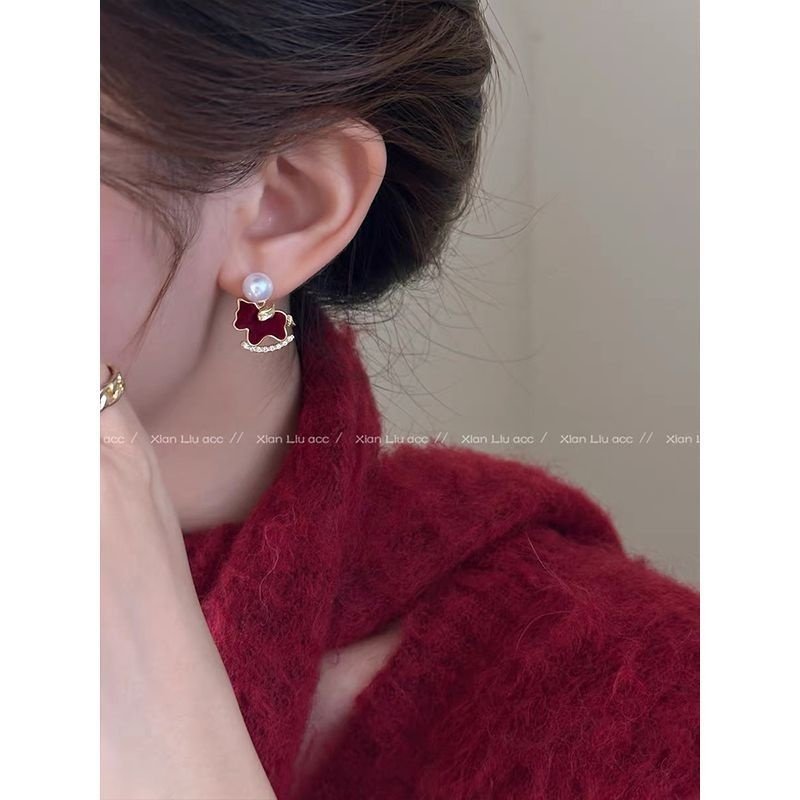 安可拉红色小马珍珠耳环耳钉女轻奢小众高级感新年秋冬耳饰精致