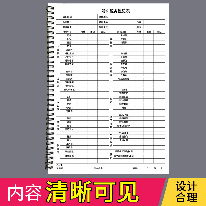 婚庆服务登记表礼仪用品顾客会员登记本婚礼用品记录本婚礼策划流程记录服务项目登记本婚庆礼仪策划信息登记