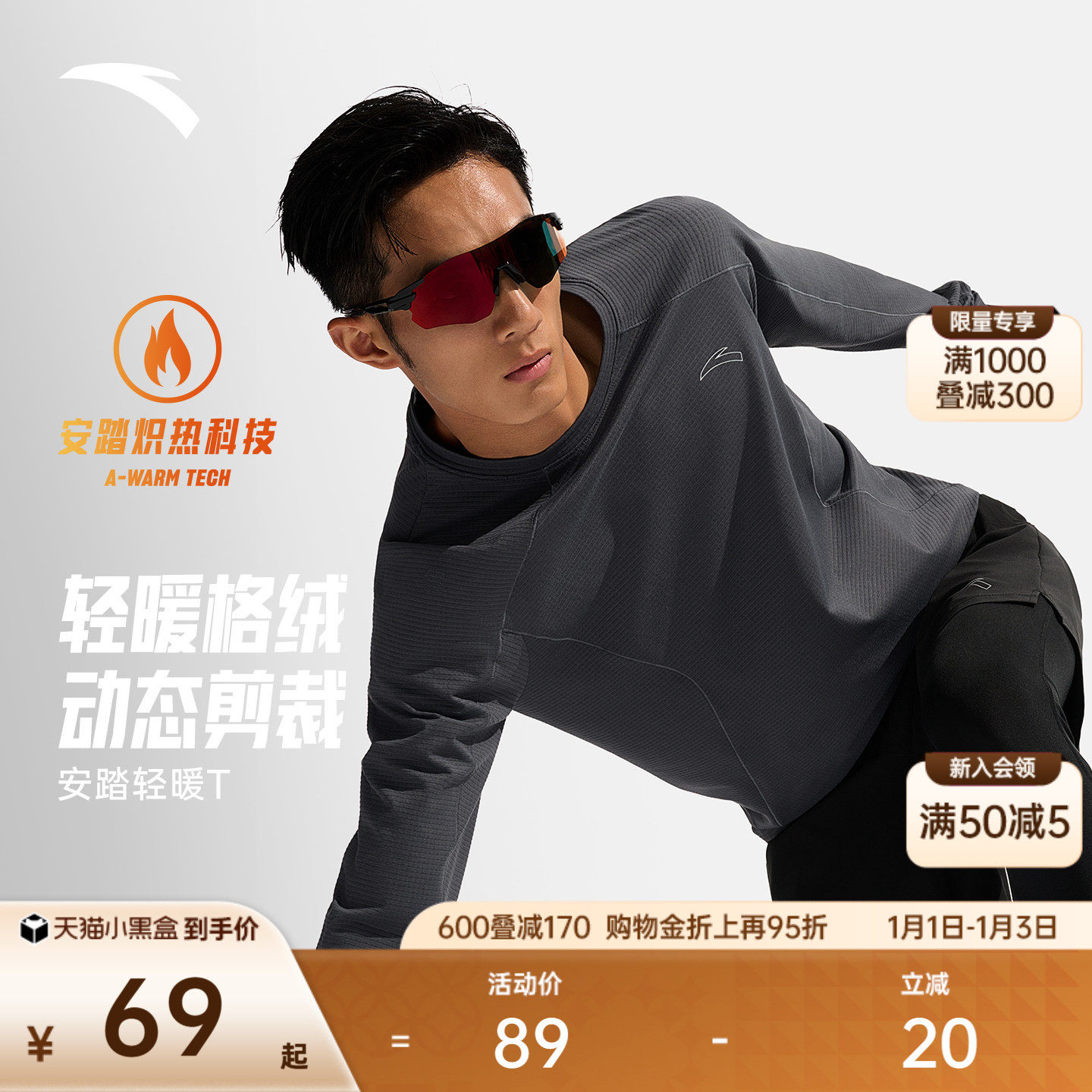 安踏速干大师丨加绒长袖t恤男冬季跑步运动上衣压缩衣健身训练服