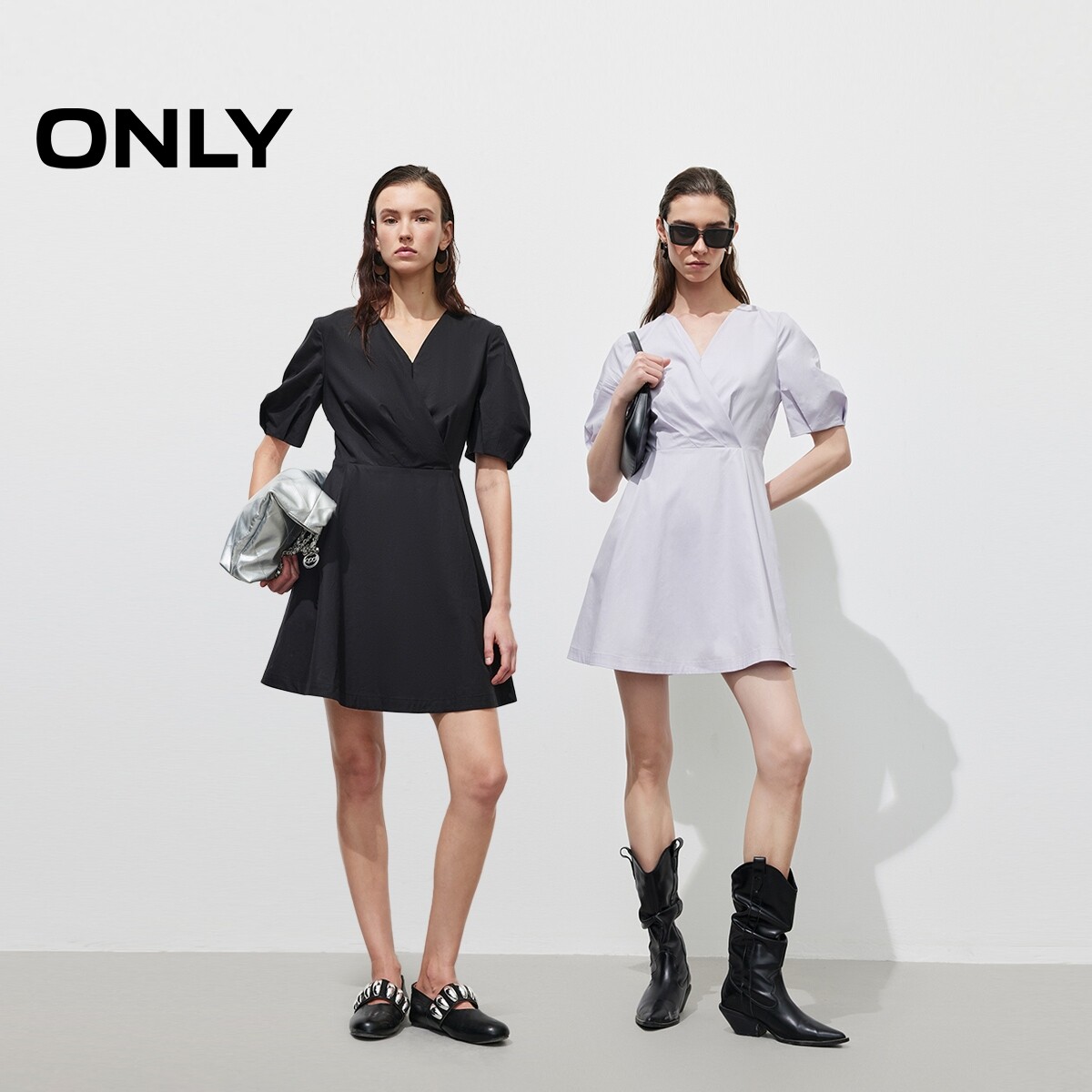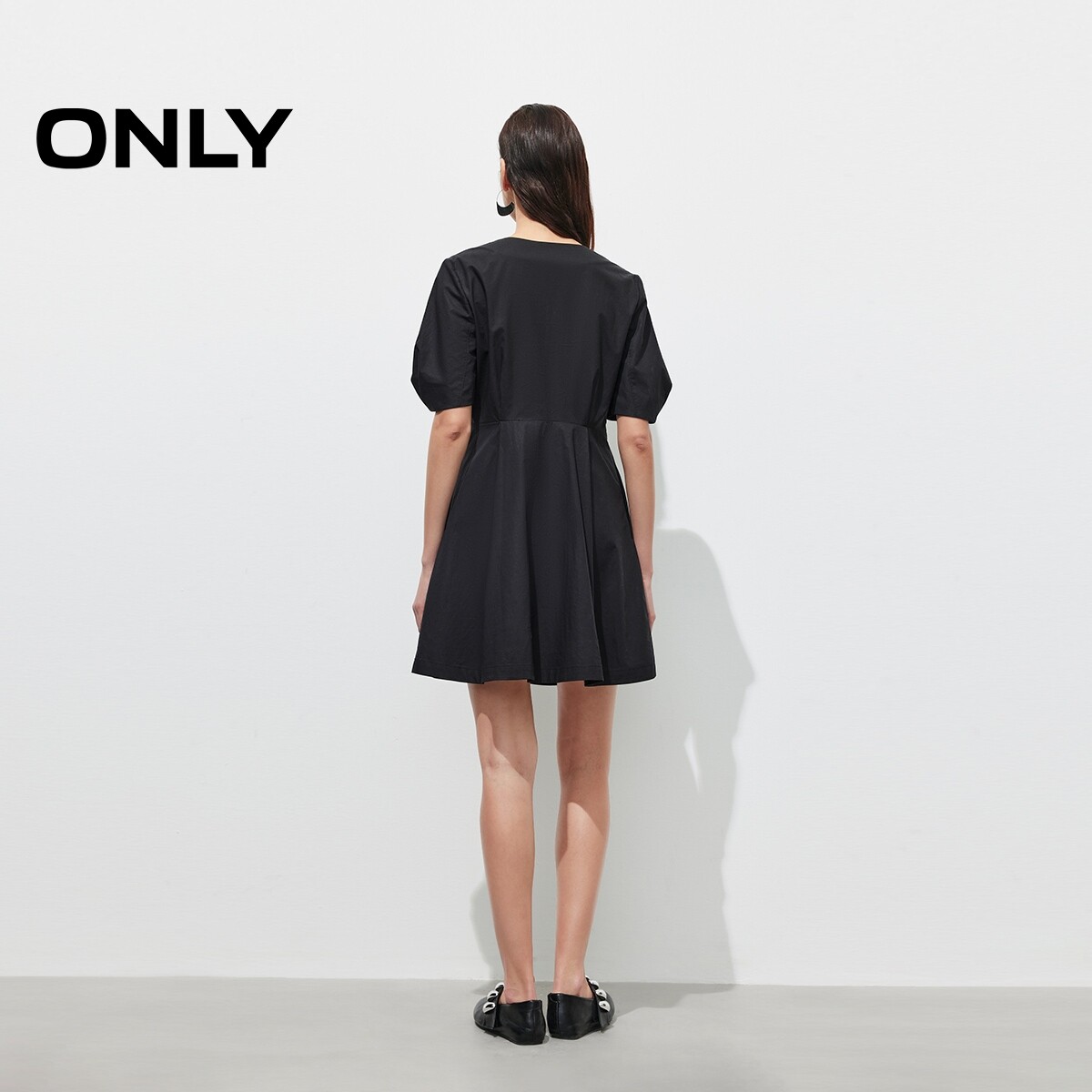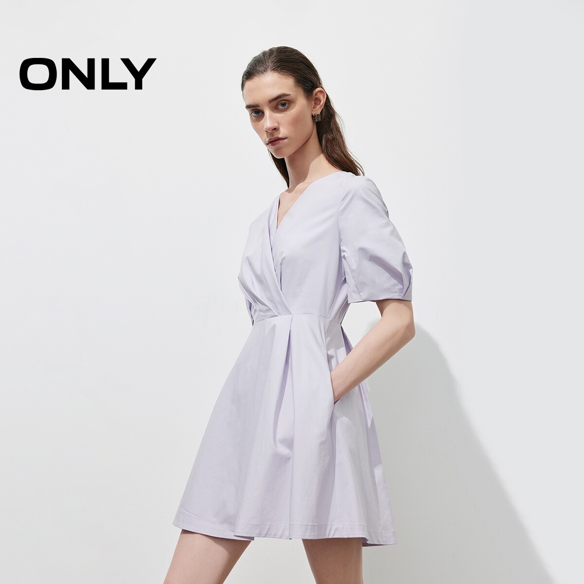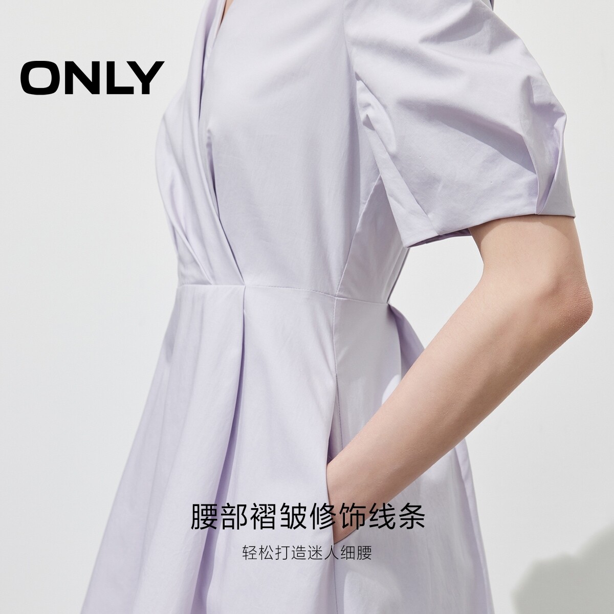 【ONLY奥莱】春季纯色短袖V领泡泡袖收腰显瘦修身短裙连衣裙女