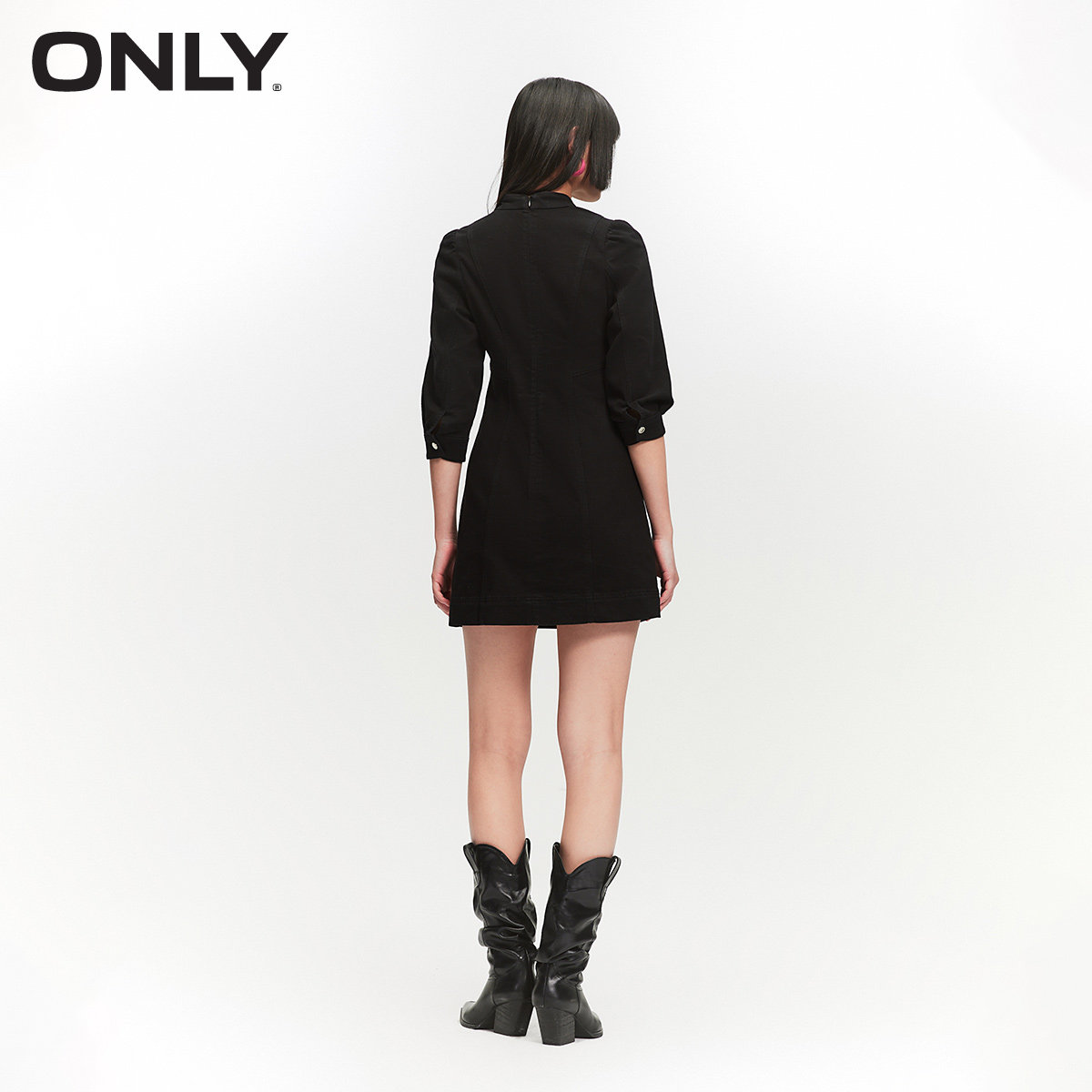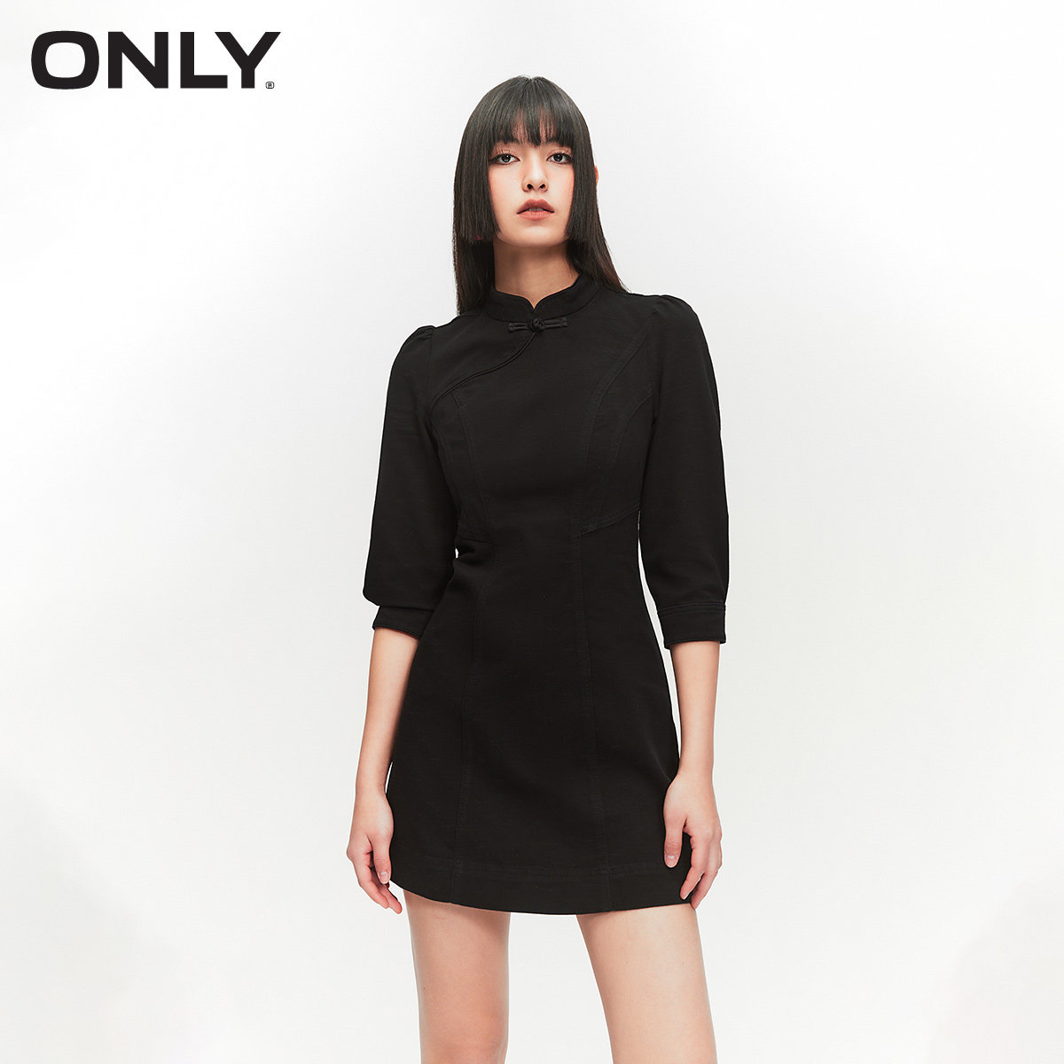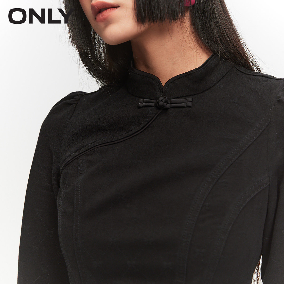 【ONLY奥莱】春季新款活性染中式立领盘扣泡泡袖短款牛仔连衣裙女