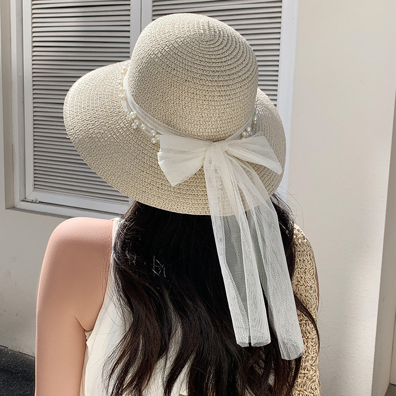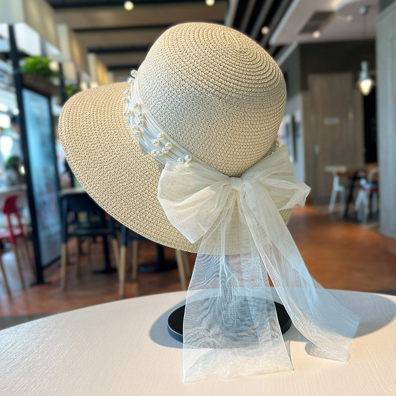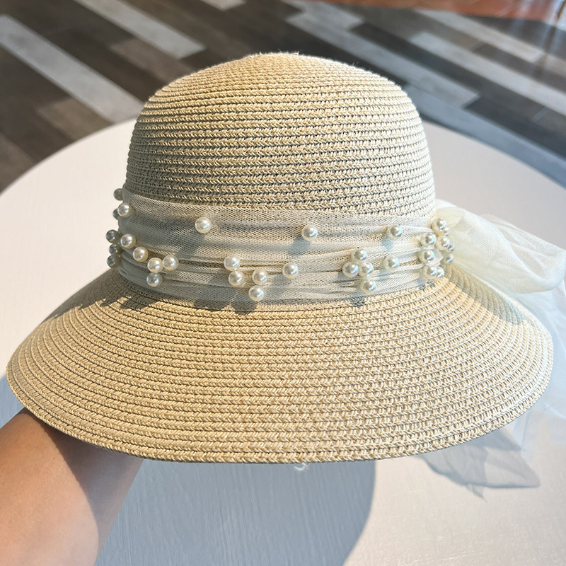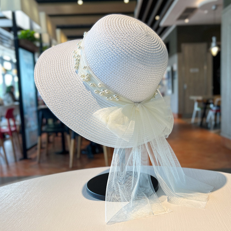夏季蕾丝珍珠草帽女海边度假沙滩防晒遮阳帽法式草编太阳帽子户外