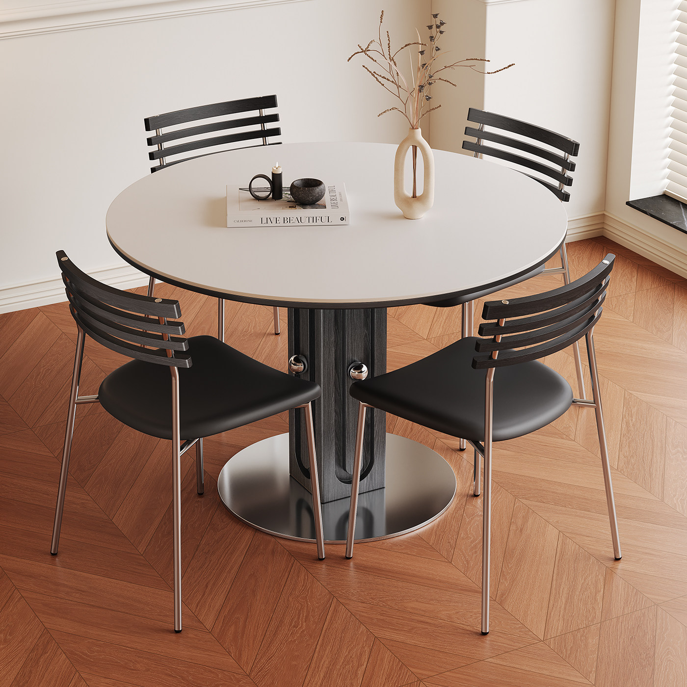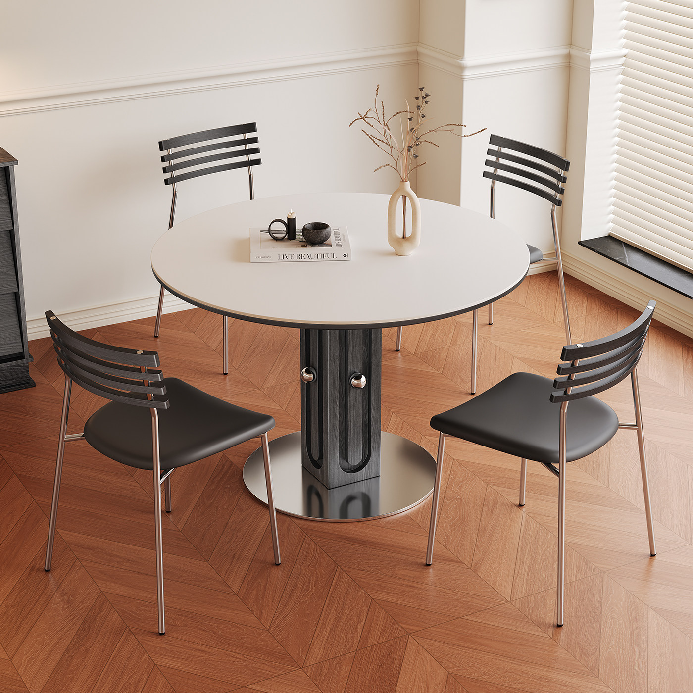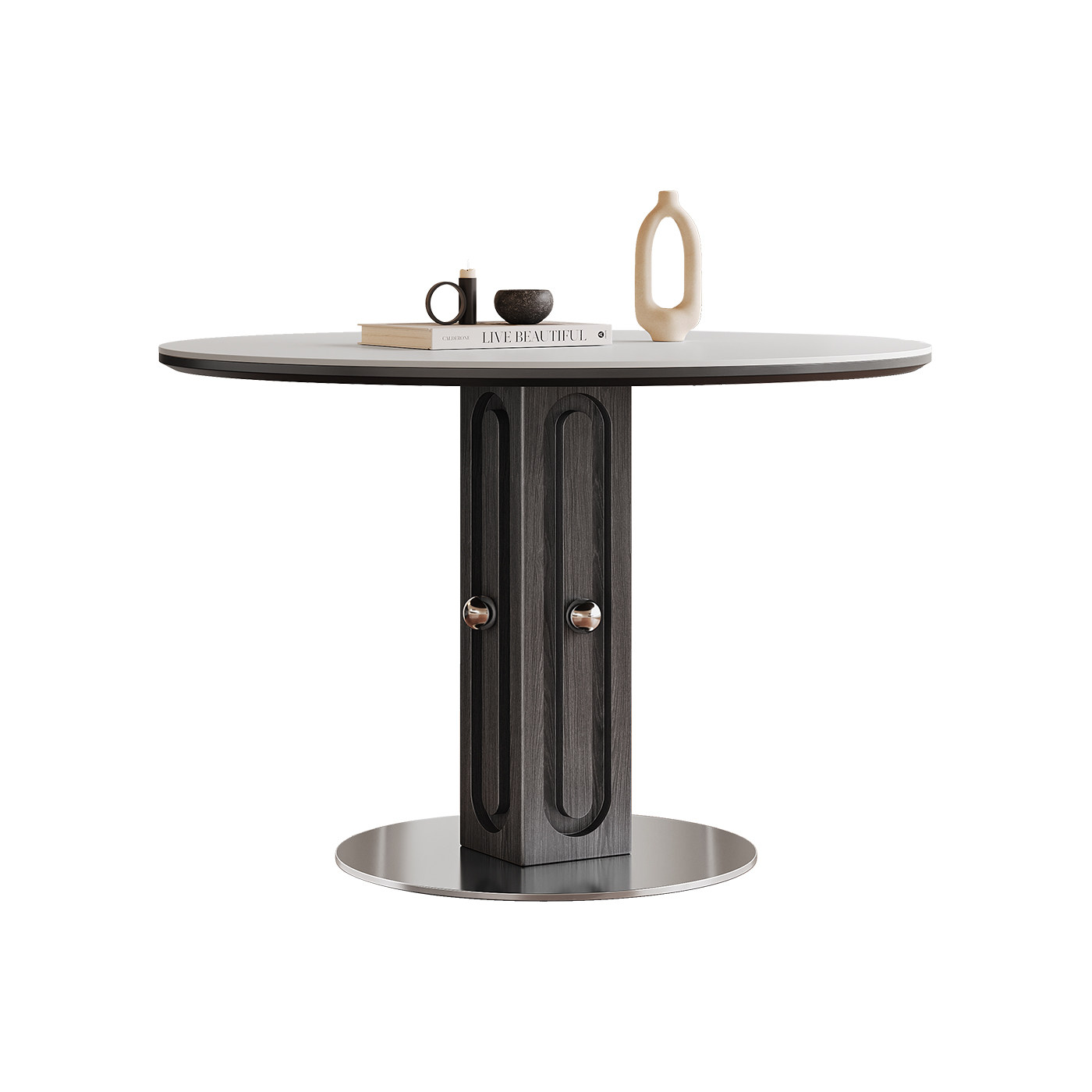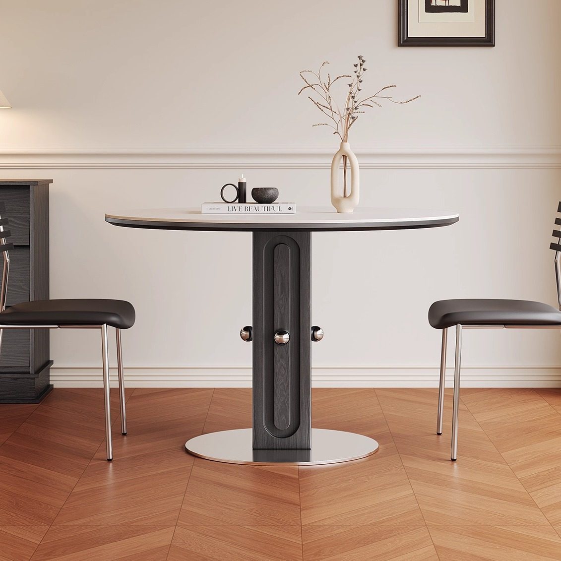 法式复古岩板餐桌家用2025新款高端小户型包豪斯全托实木圆形餐桌
