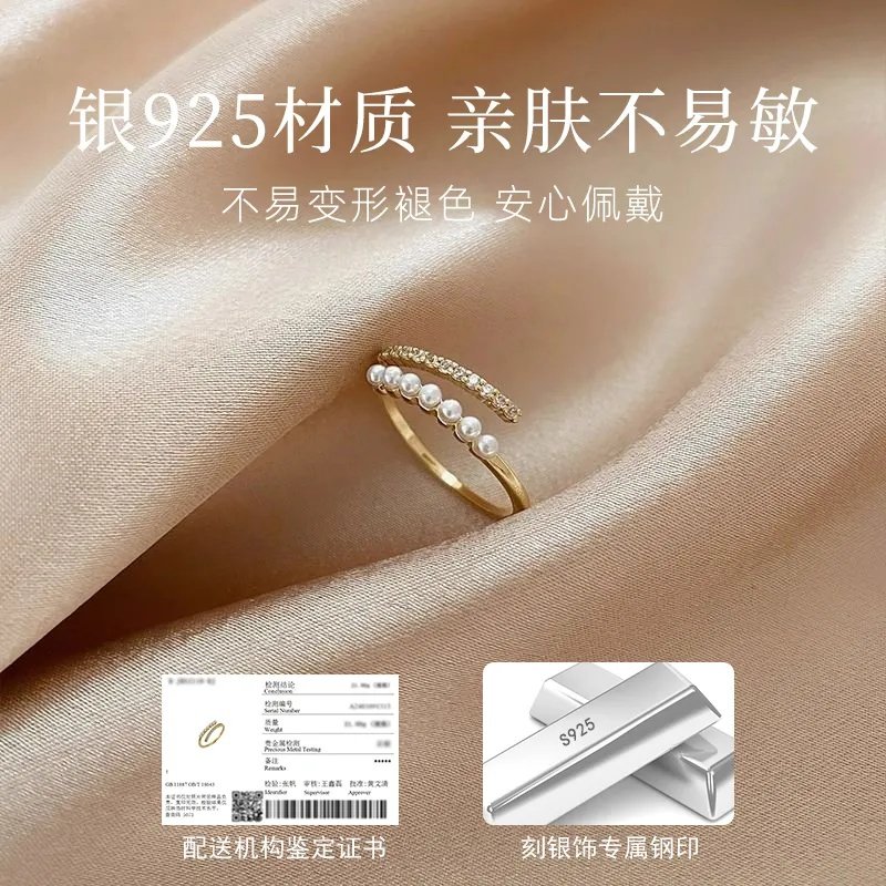央创纯银珠叶漫女戒指新款个性时尚仿珍珠开口食指环S925