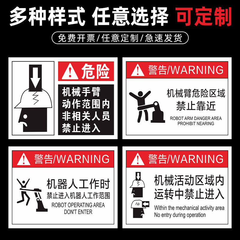 机器人警示牌机械臂运转动作范围危险区域内非相关人员禁止进入标识牌设备机械手作业小心请勿靠近危险吊挂牌
