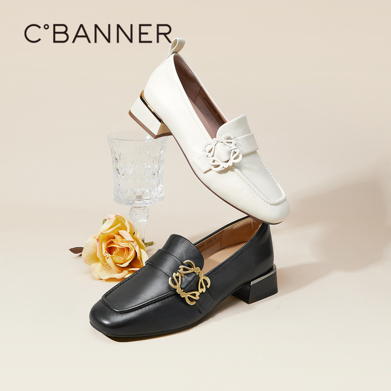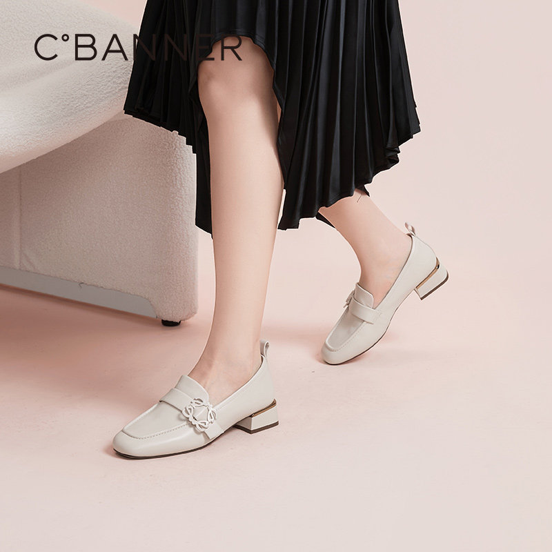 千百度女鞋秋季新款乐福鞋英伦中跟小皮鞋一脚蹬真皮通勤正装