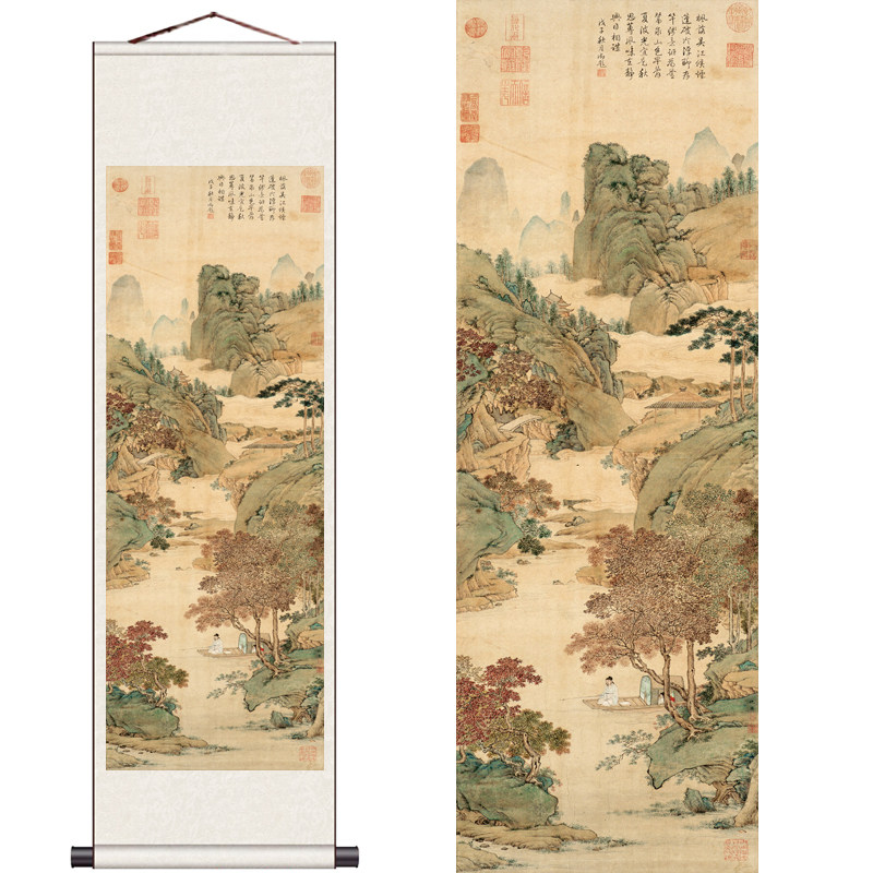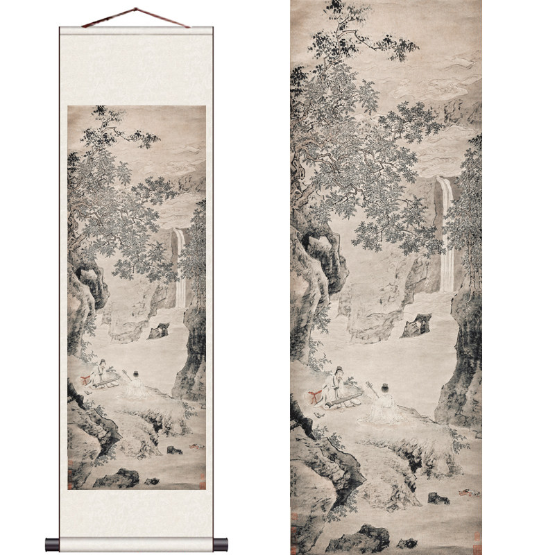 仿古画文徵明品茶图山水画水墨画装饰画国画仇英桃源仙境泛舟图