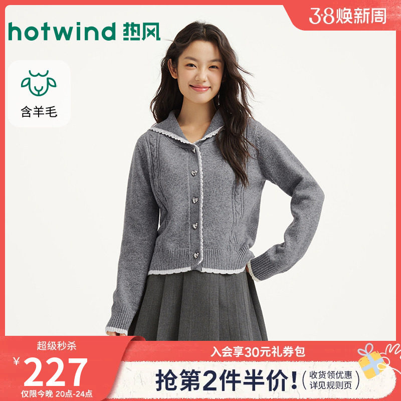 热风2026年春季新款女士甜美学院风翻领针织开衫含羊毛
