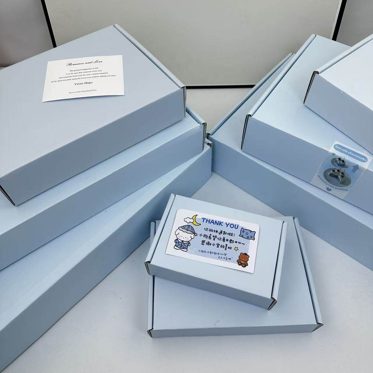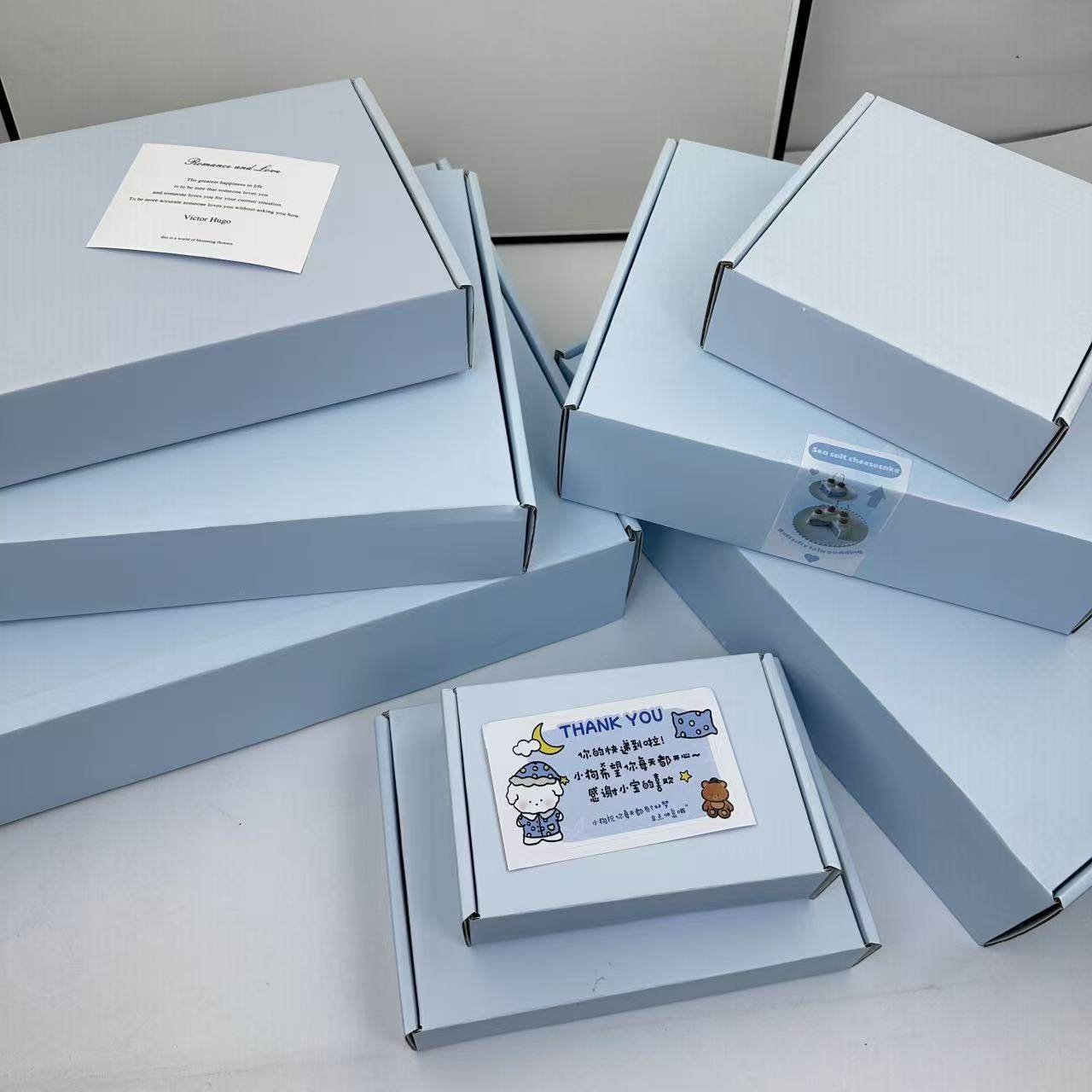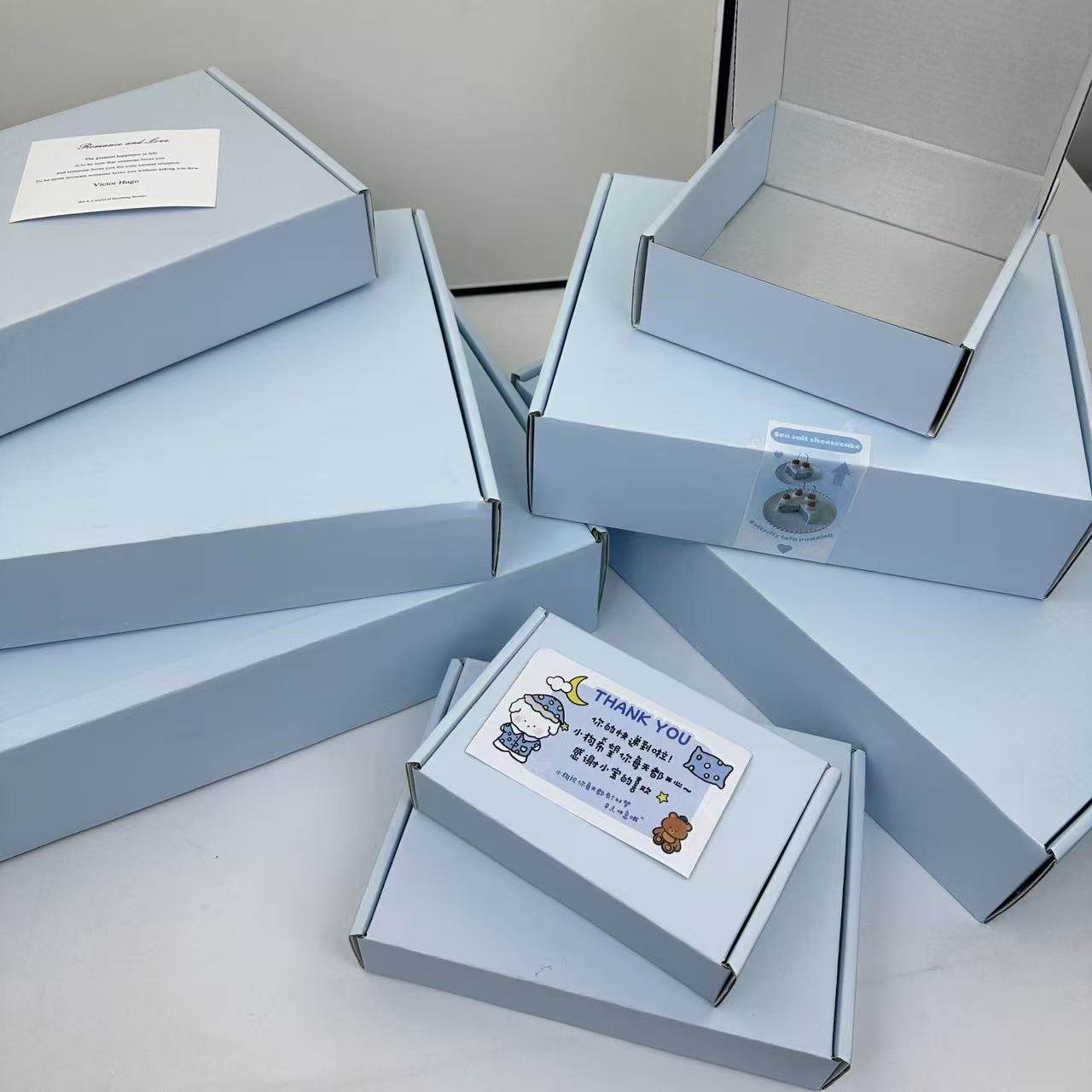 打包飞机盒包装盒ins加厚特硬浅蓝色覆膜小卡吧唧服装收纳礼物