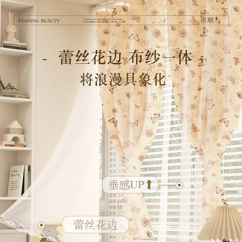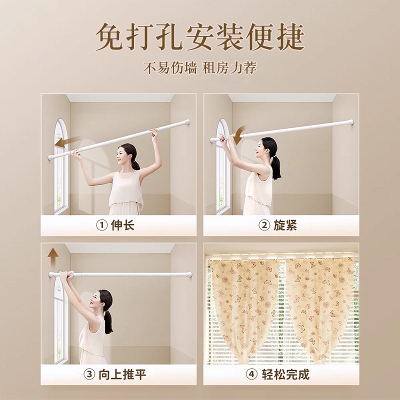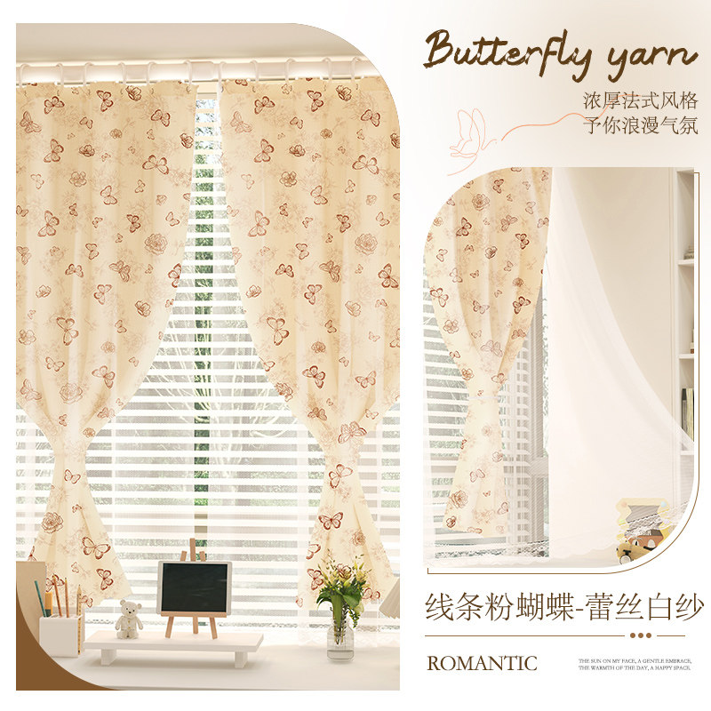 免打孔窗帘法式小清新纱帘一体伸缩杆隔断帘子儿童房客厅遮阳防摔