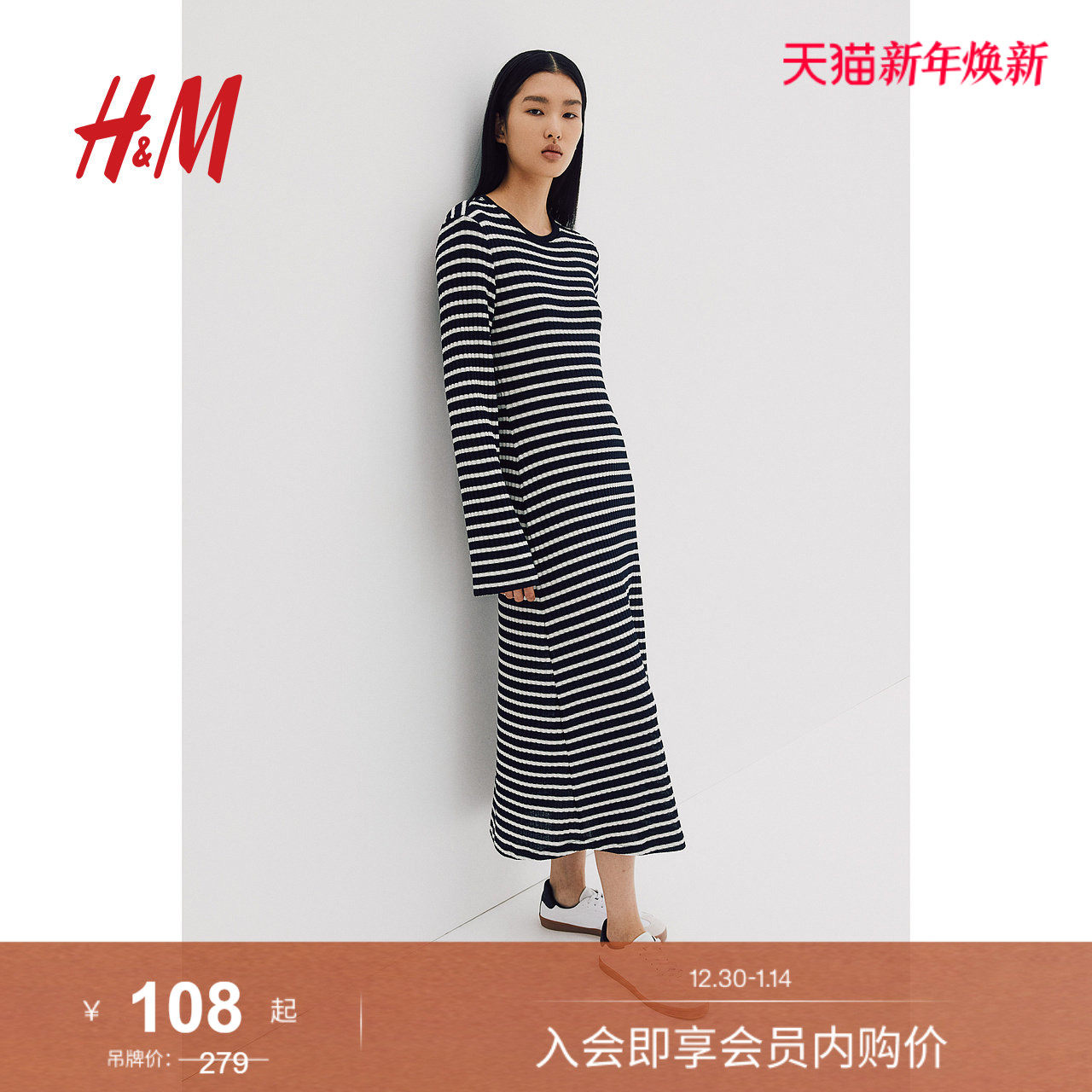 HM女装连衣裙冬季修身休闲条纹圆领长袖中长裙1240140