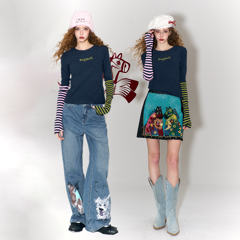 妖精的口袋条纹撞色拼接长袖t恤女2026春新款修身底衫内搭打上衣