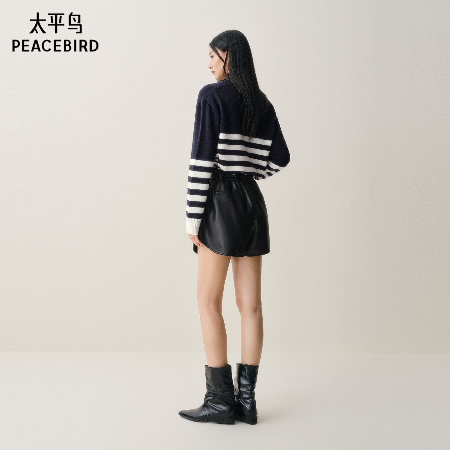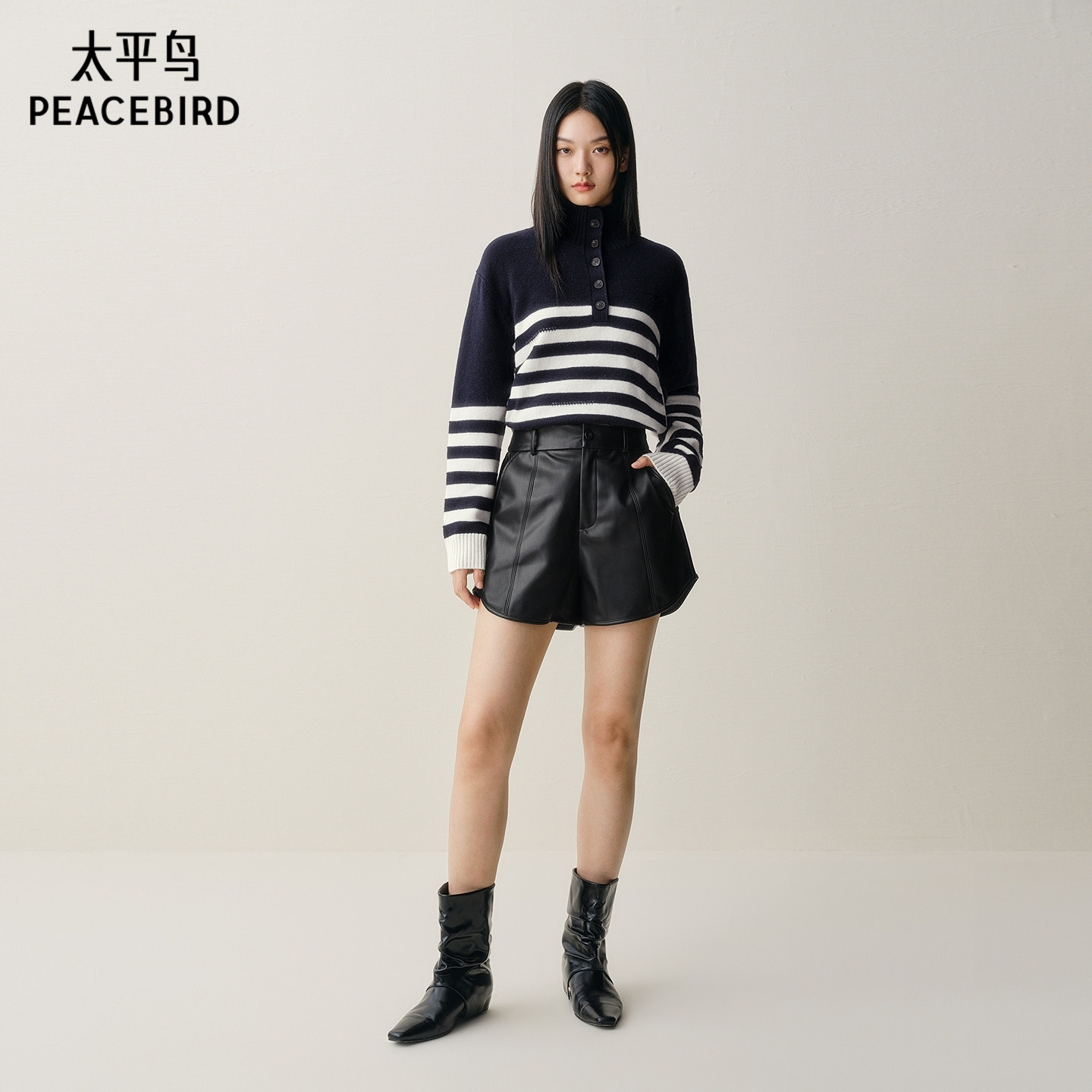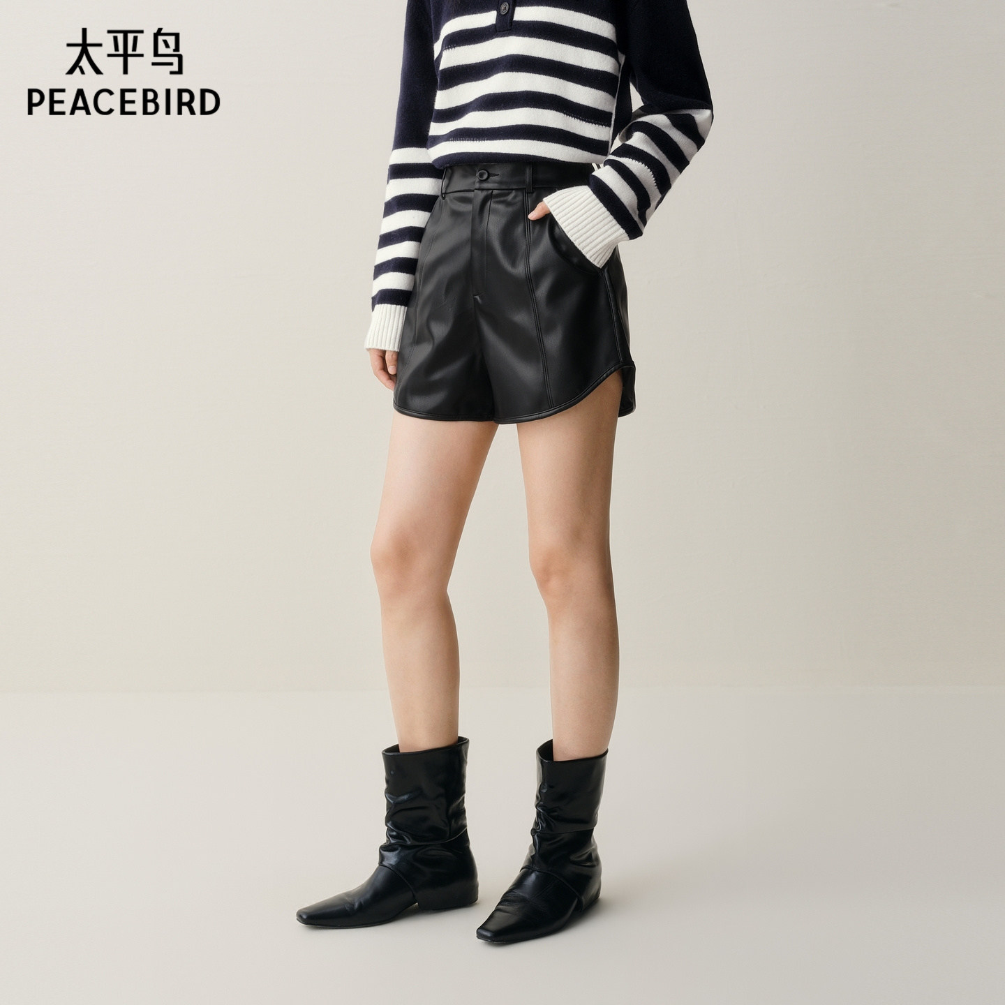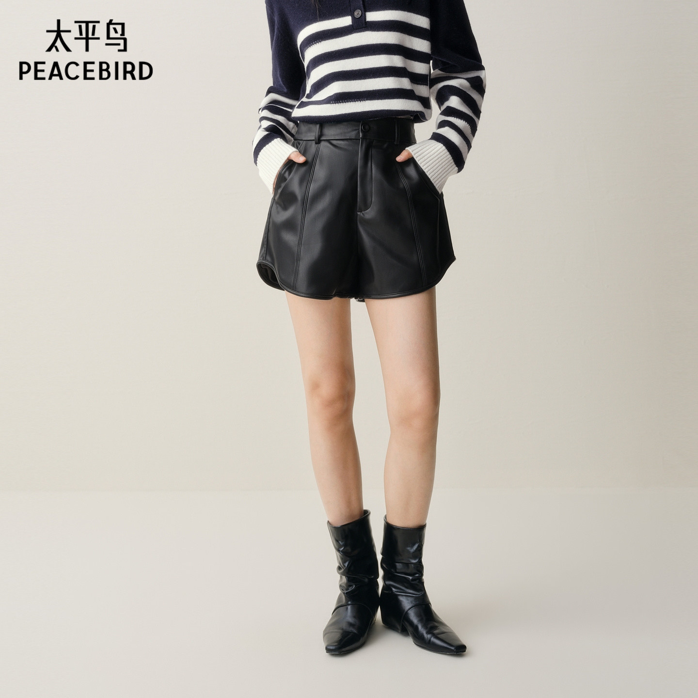 太平鸟黑色PU短裤设计感品质高腰宽松休闲裤PU短裤女A1GCE416Y