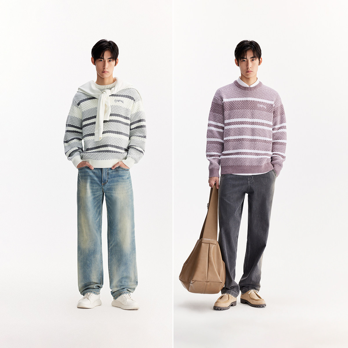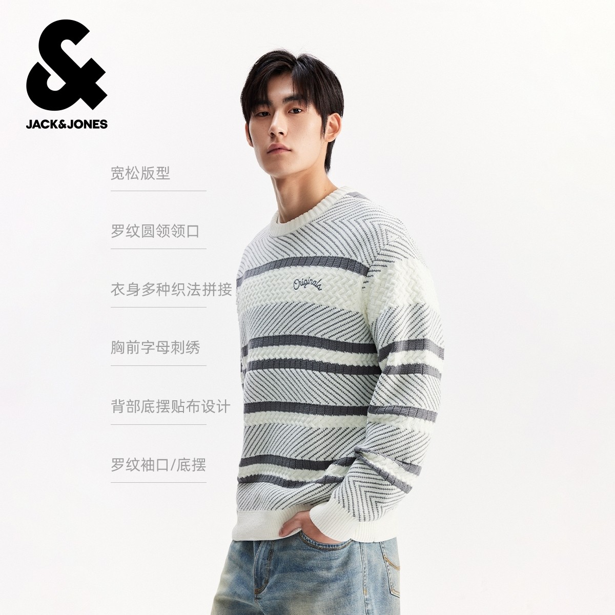 杰克琼斯男装冬季新款字母刺绣休闲条纹拼接宽松圆领毛衣针织衫