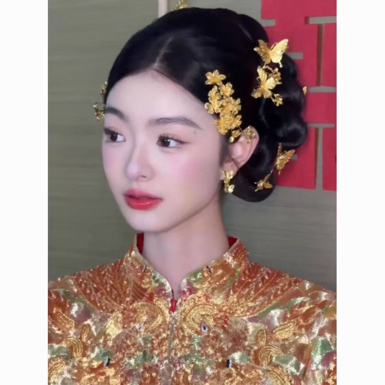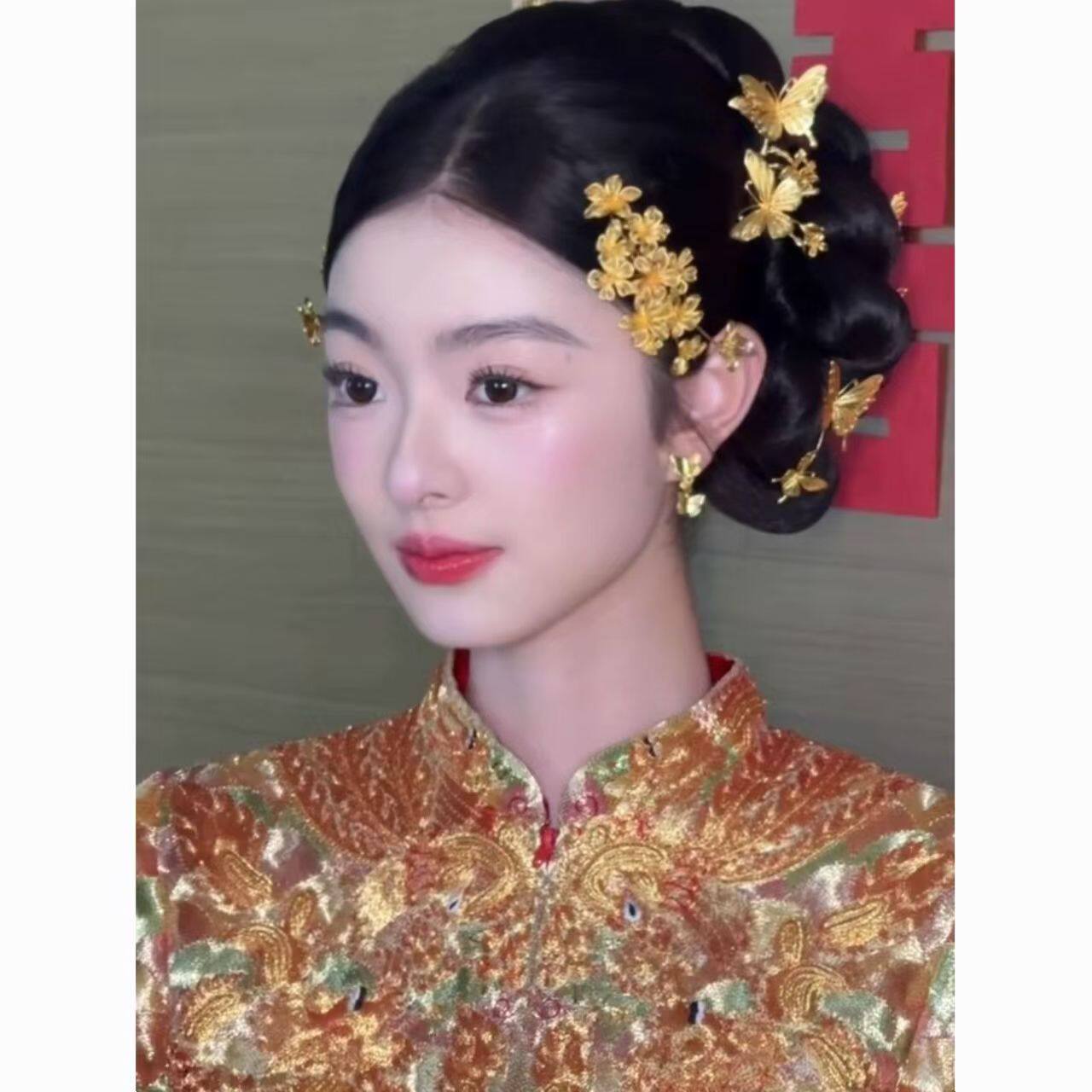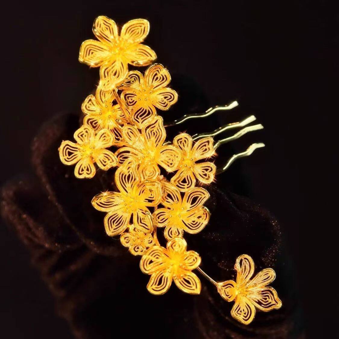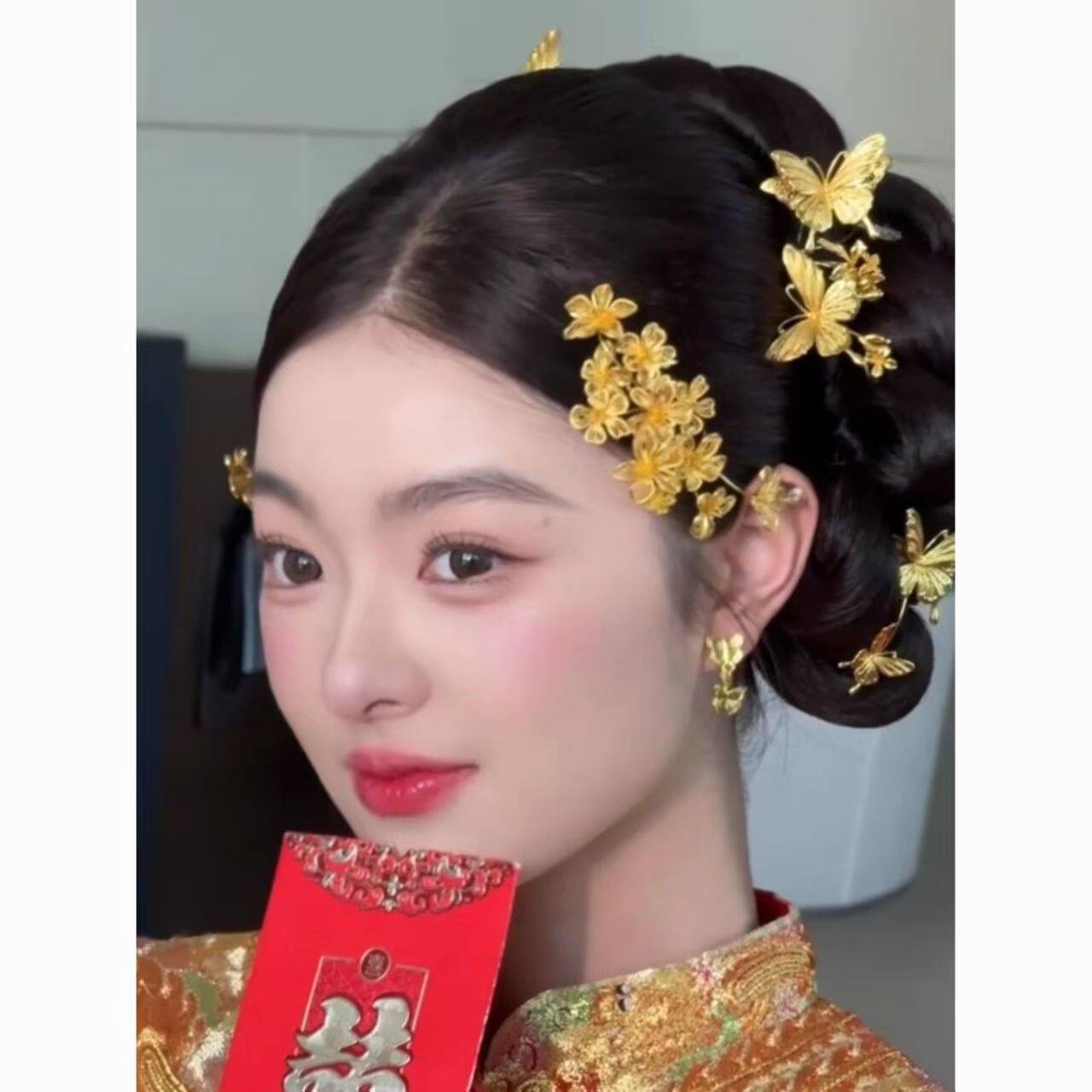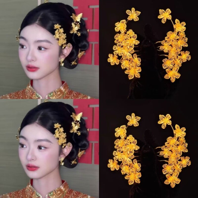 新娘金色花朵发梳秀禾喜庆头饰侧边龙凤褂旗袍配饰百搭女中式婚礼