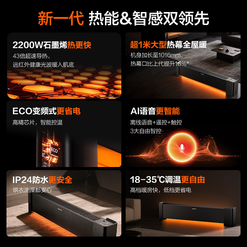 艾美特AI语音石墨烯踢脚线取暖器家用暖风机节能电暖器烤火炉新款