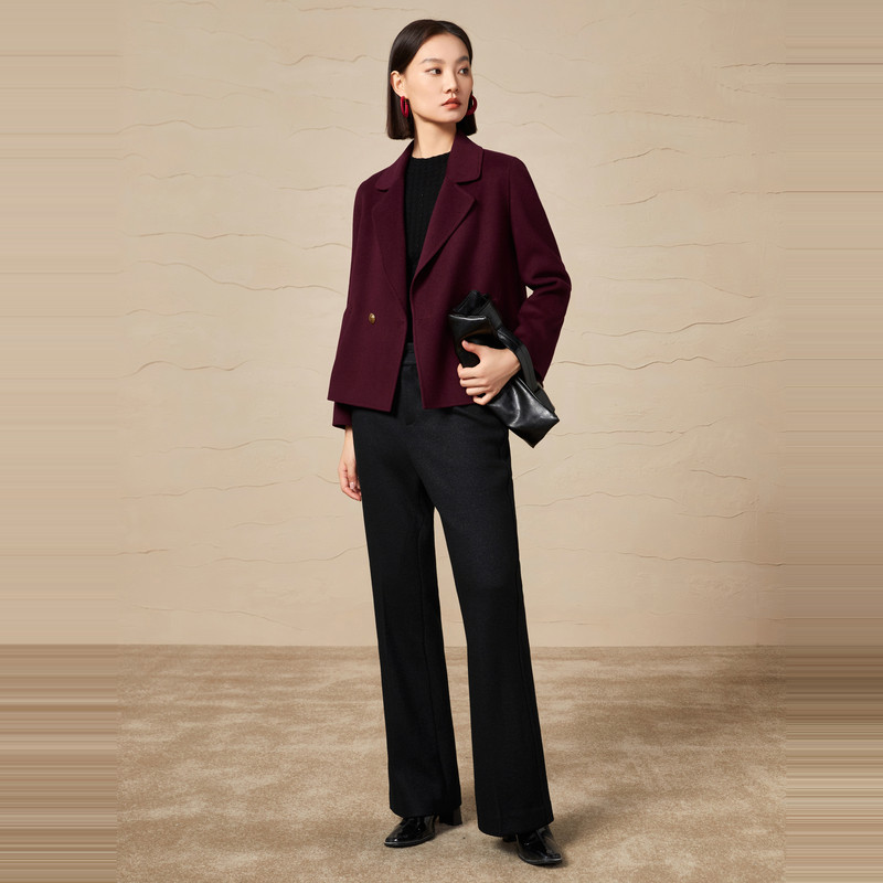 水沐飞高级感酒红色双面羊绒大翻领毛呢大衣女秋冬中长款羊毛外套
