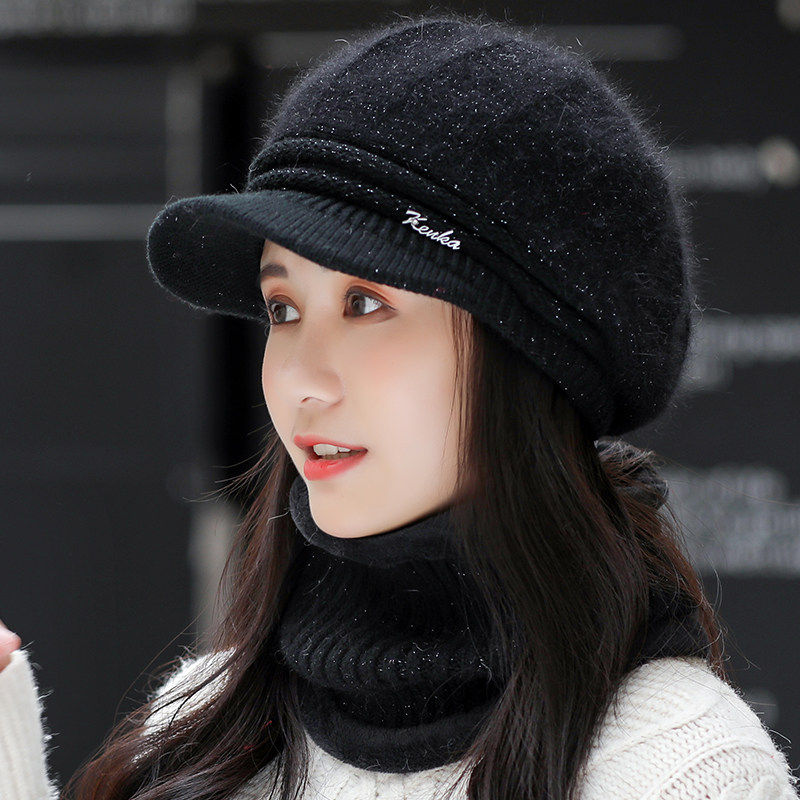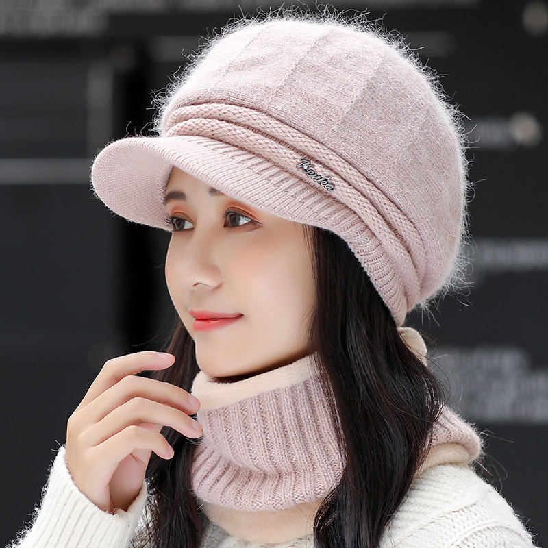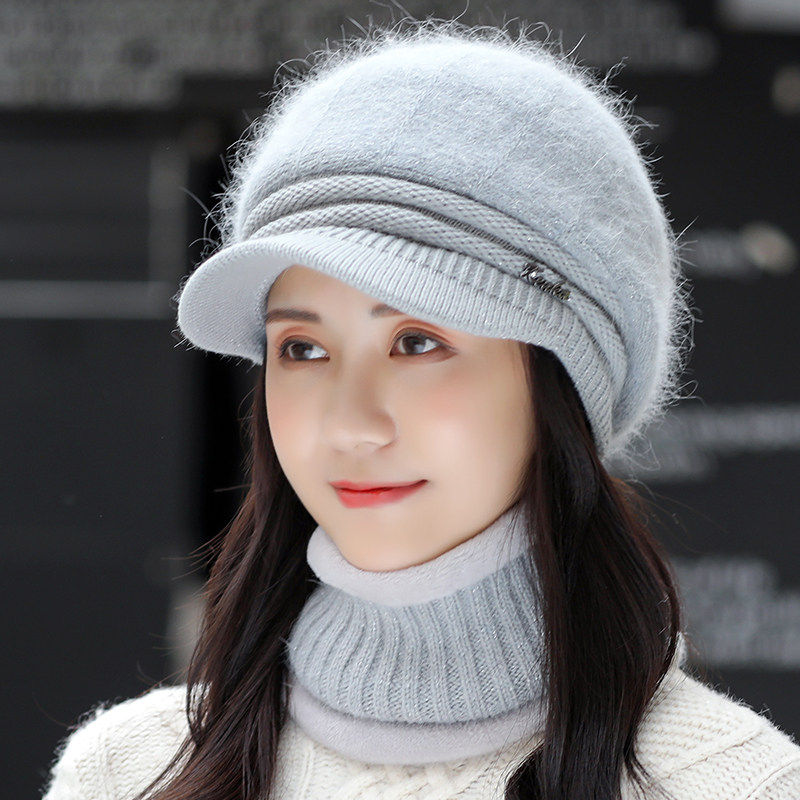 中老年帽子女士冬季针织帽加厚保暖短檐毛线帽寒兔毛帽子围脖套装