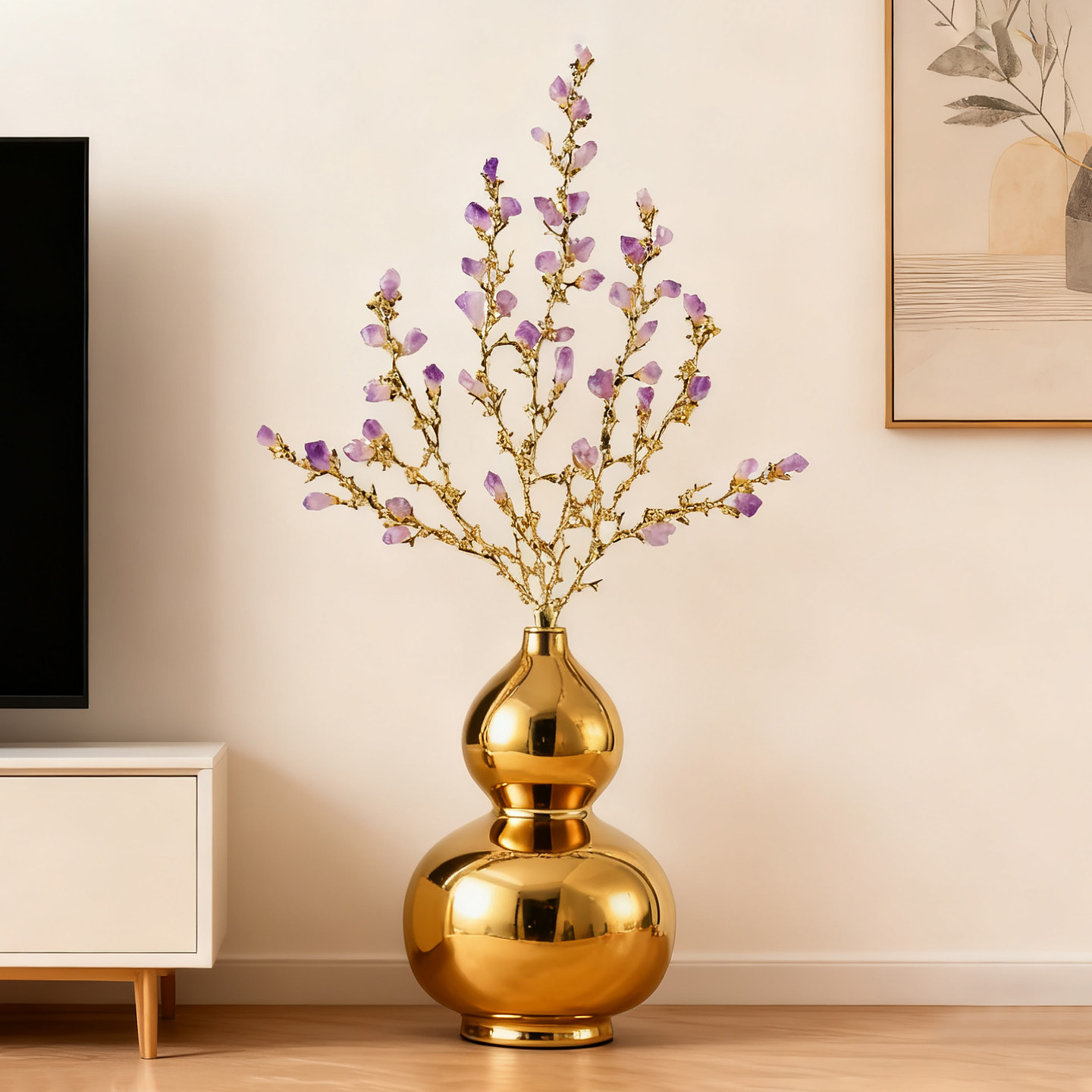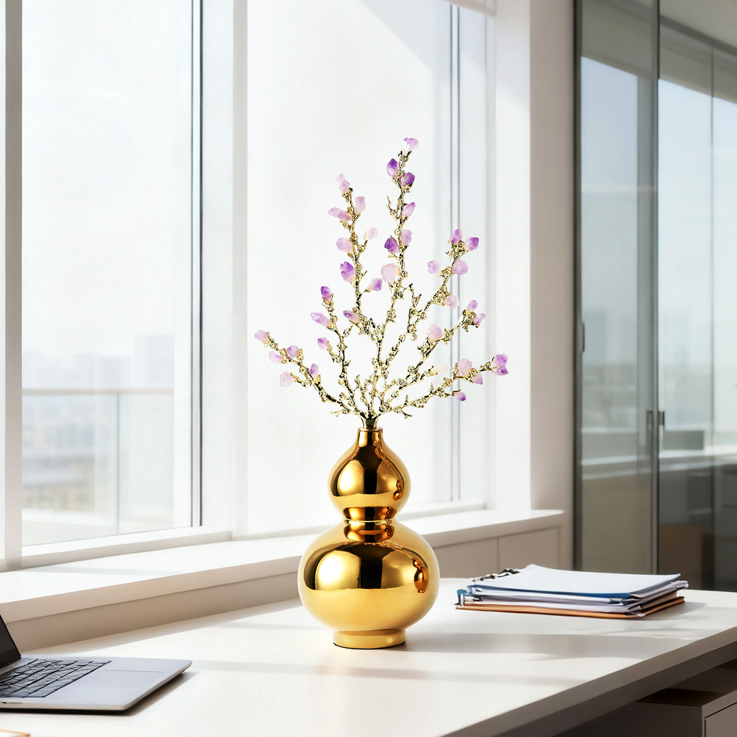 合金花枝 紫晶石点缀花朵 镀金陶瓷瓶身