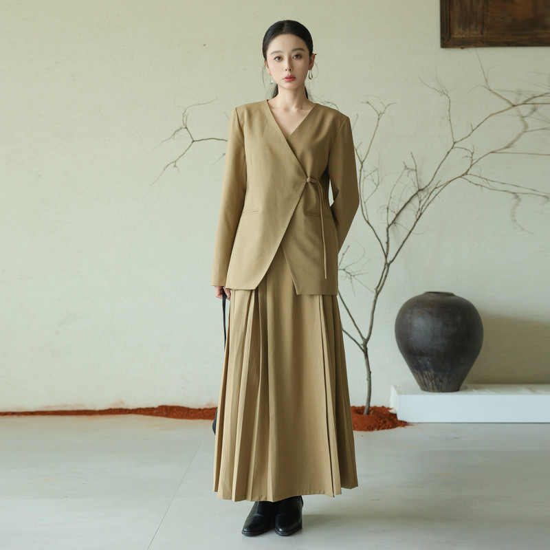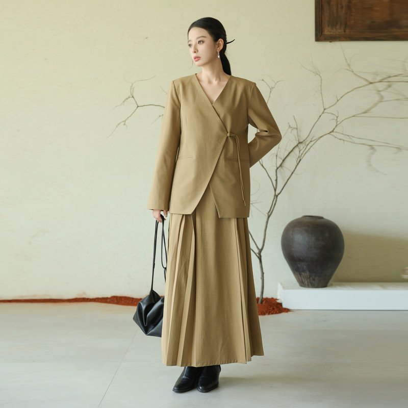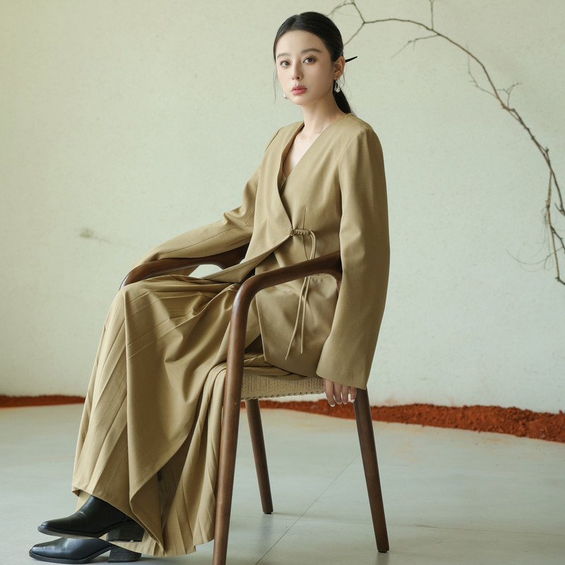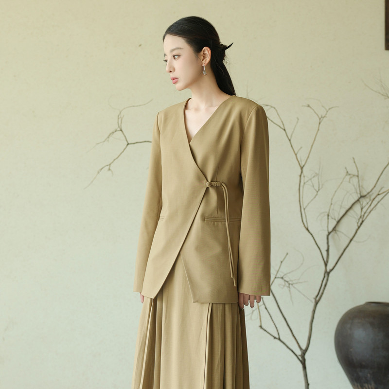 黑标BAIZHUO秋季新款新中式轻薄无领斜襟系带设计感西装AZ43XZ215