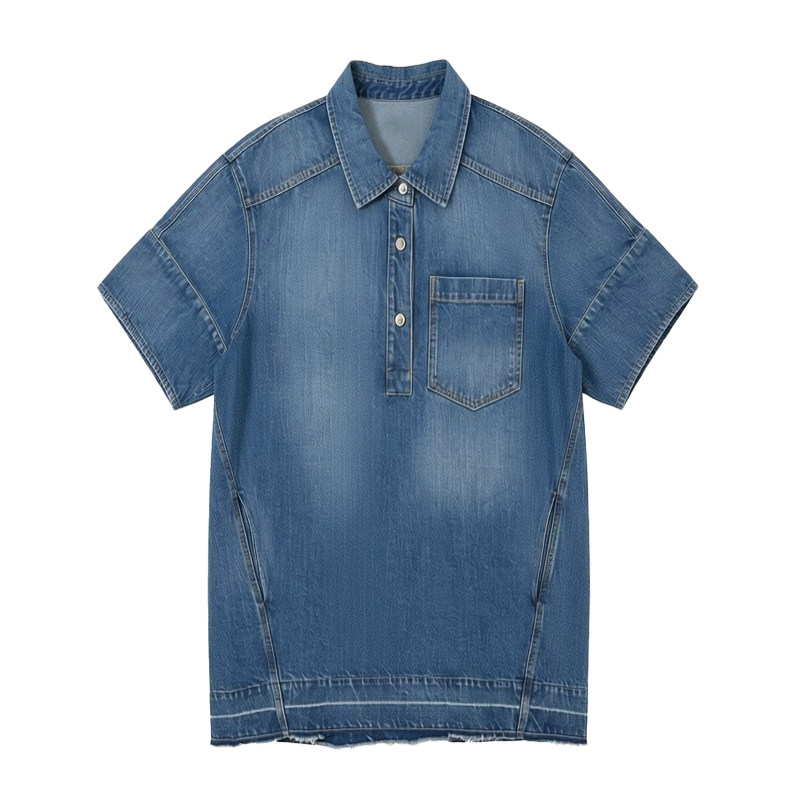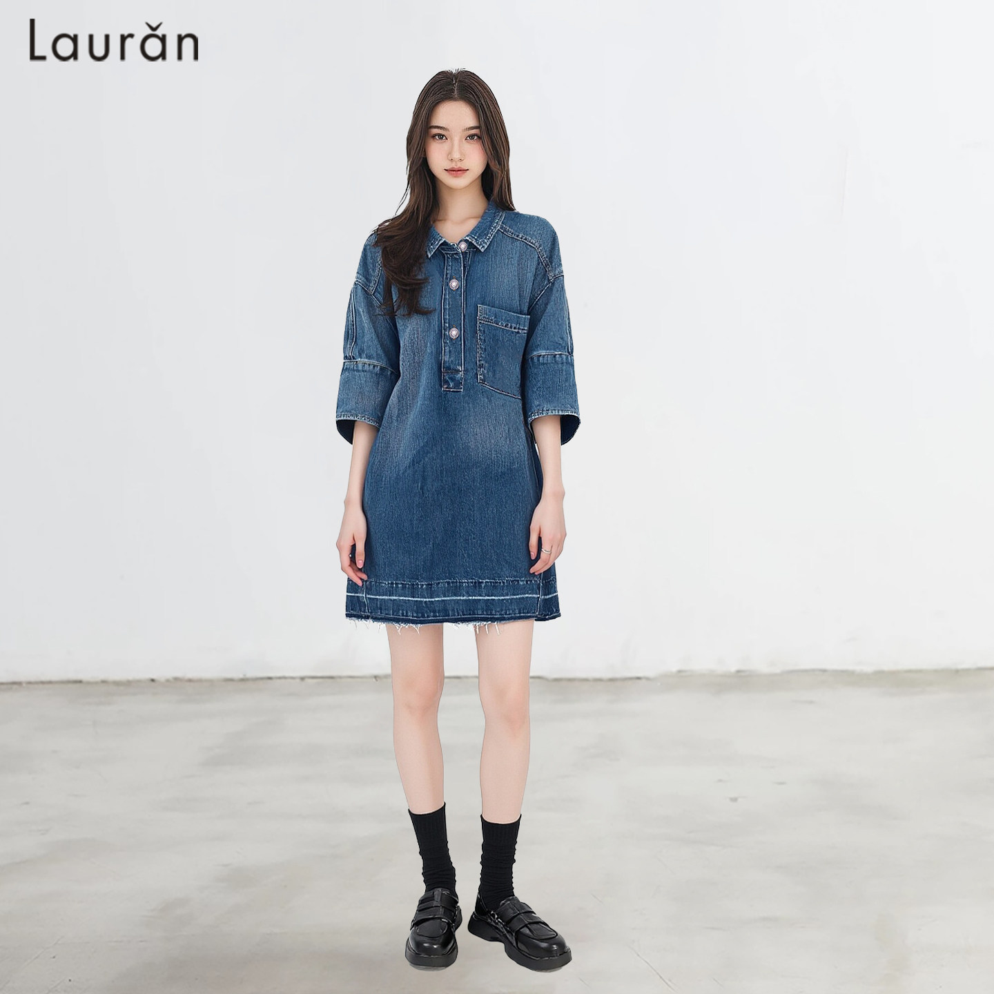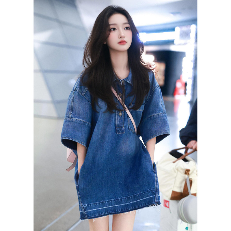 章若楠同款复古蓝翻领牛仔连衣裙女设计感休闲风宽松显瘦短袖裙子