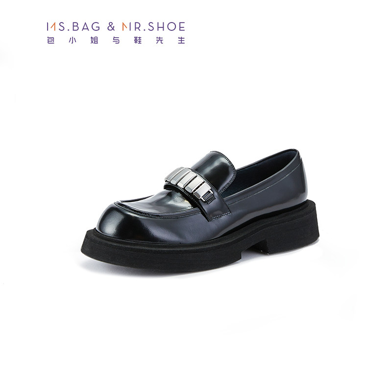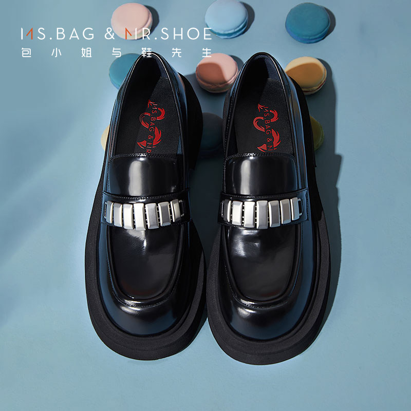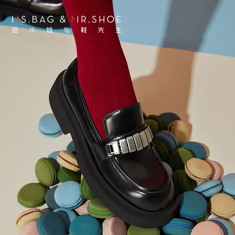 包小姐与鞋先生春季圆头厚底牛皮开边珠深口乐福鞋女