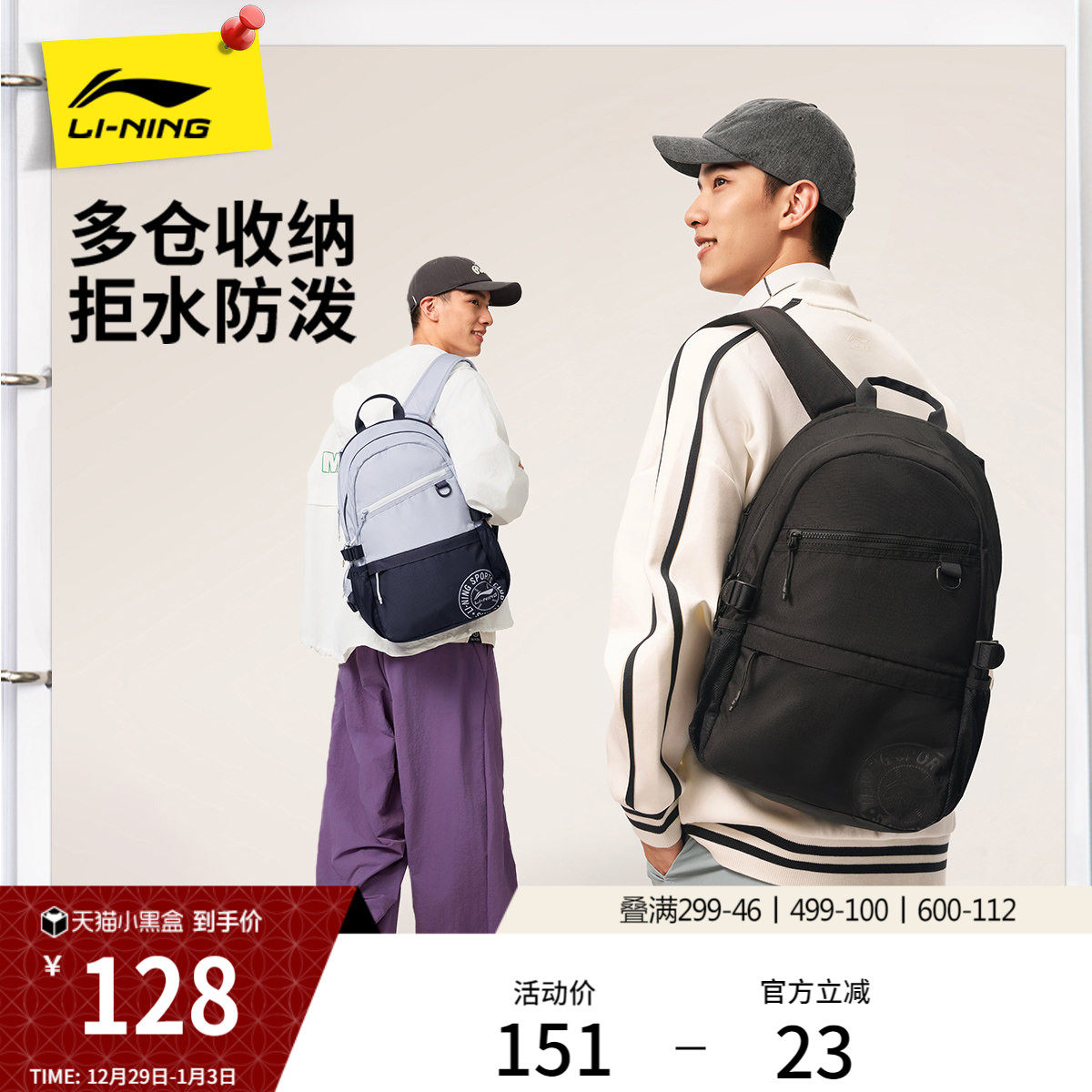 李宁双肩包男女2026新款通勤旅游轻便防泼水背包学生书包运动包