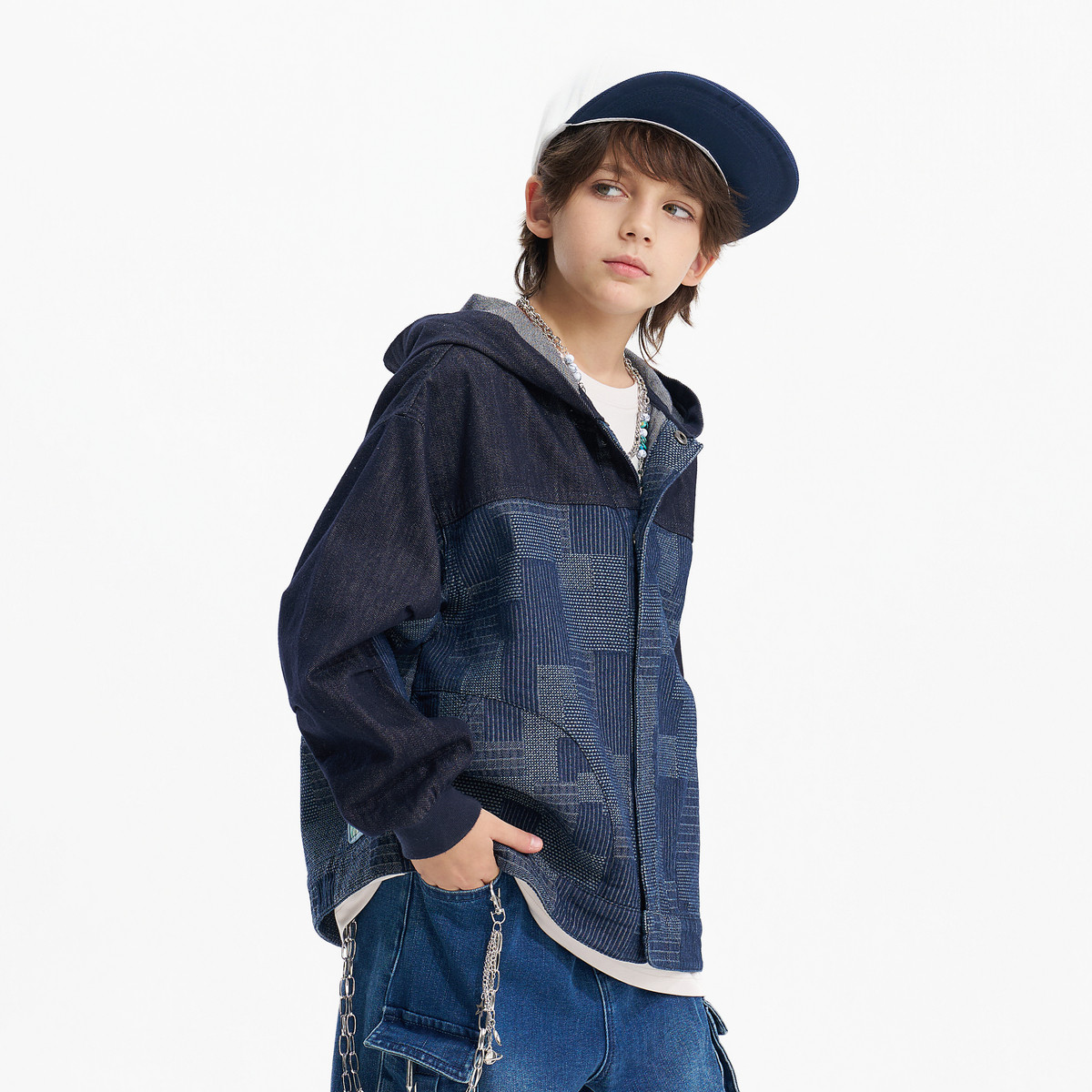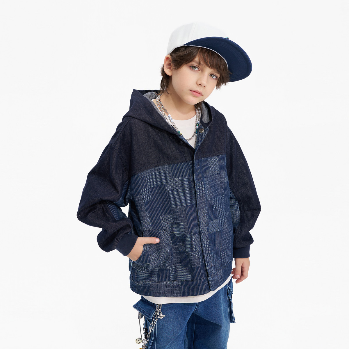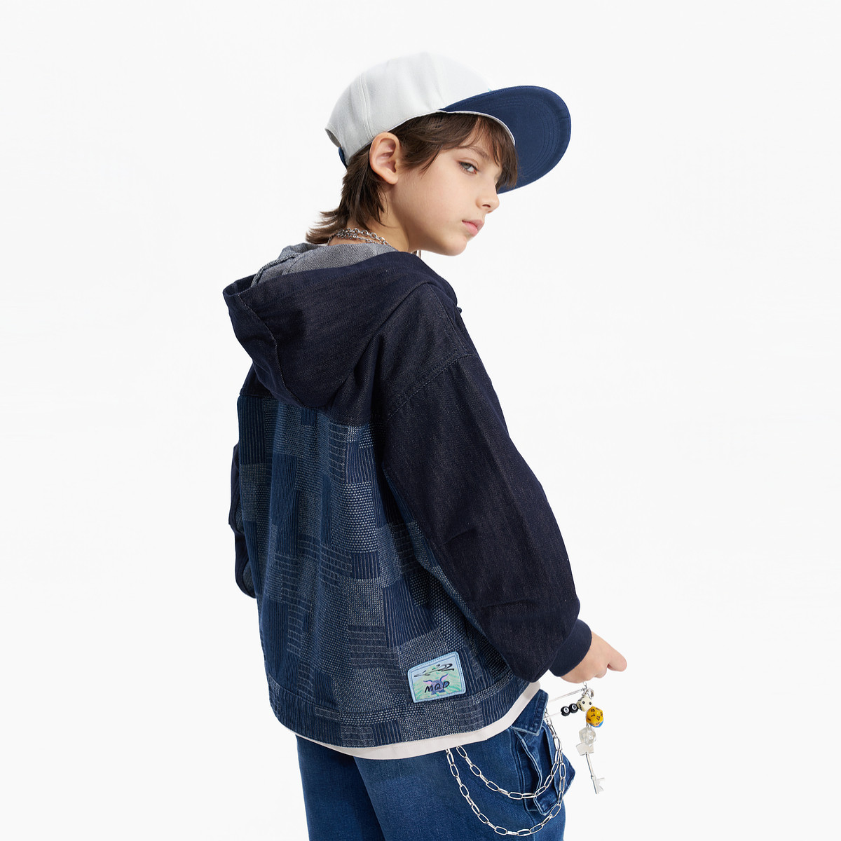 MQD童装男童牛仔外套2026春季新款儿童连帽提花拼接宽松休闲开衫