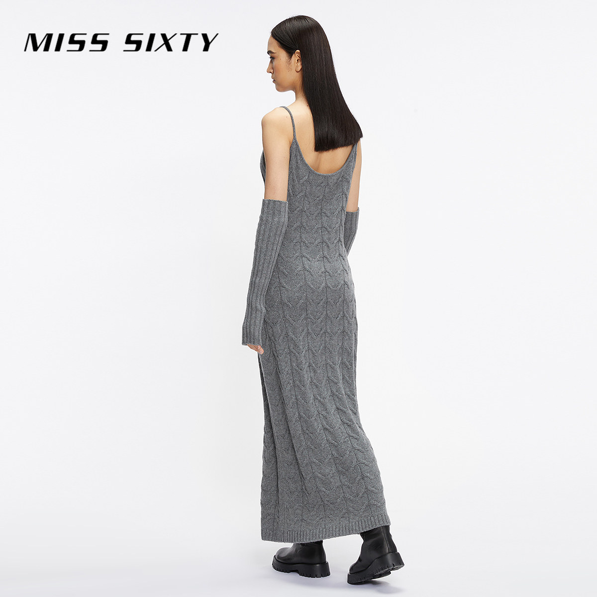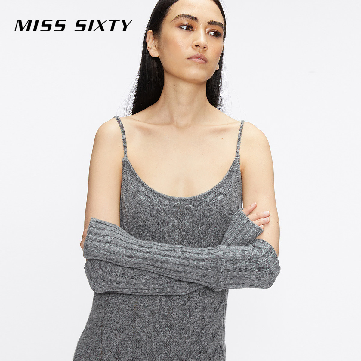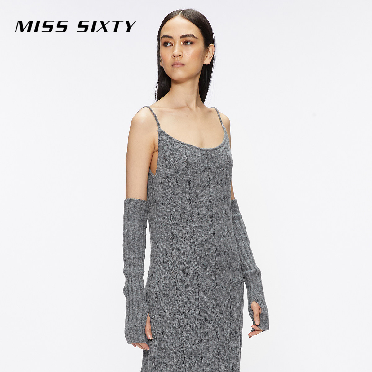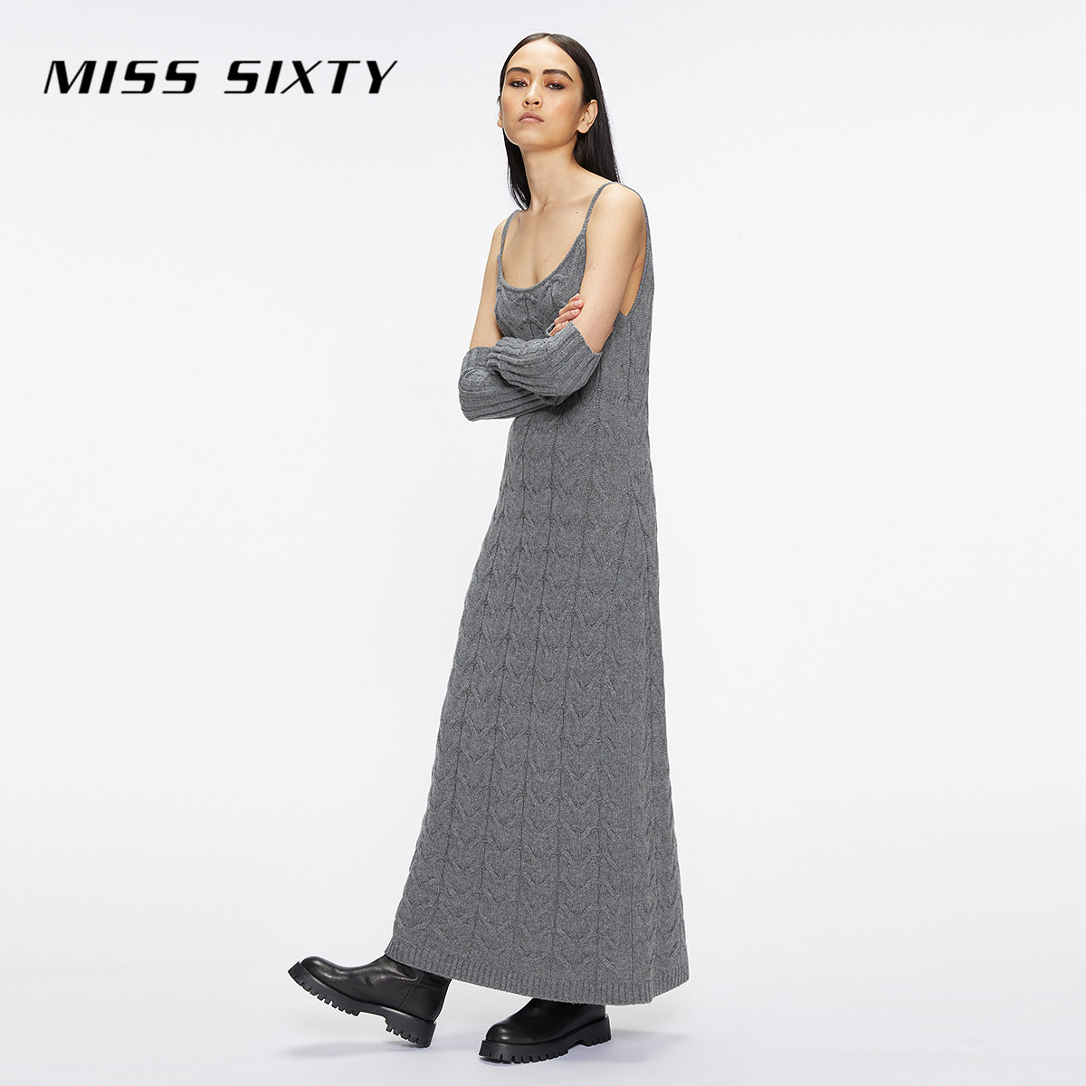 Miss Sixty绵羊毛针织连身连衣裙女复古麻花性感吊带裙附袖套长裙