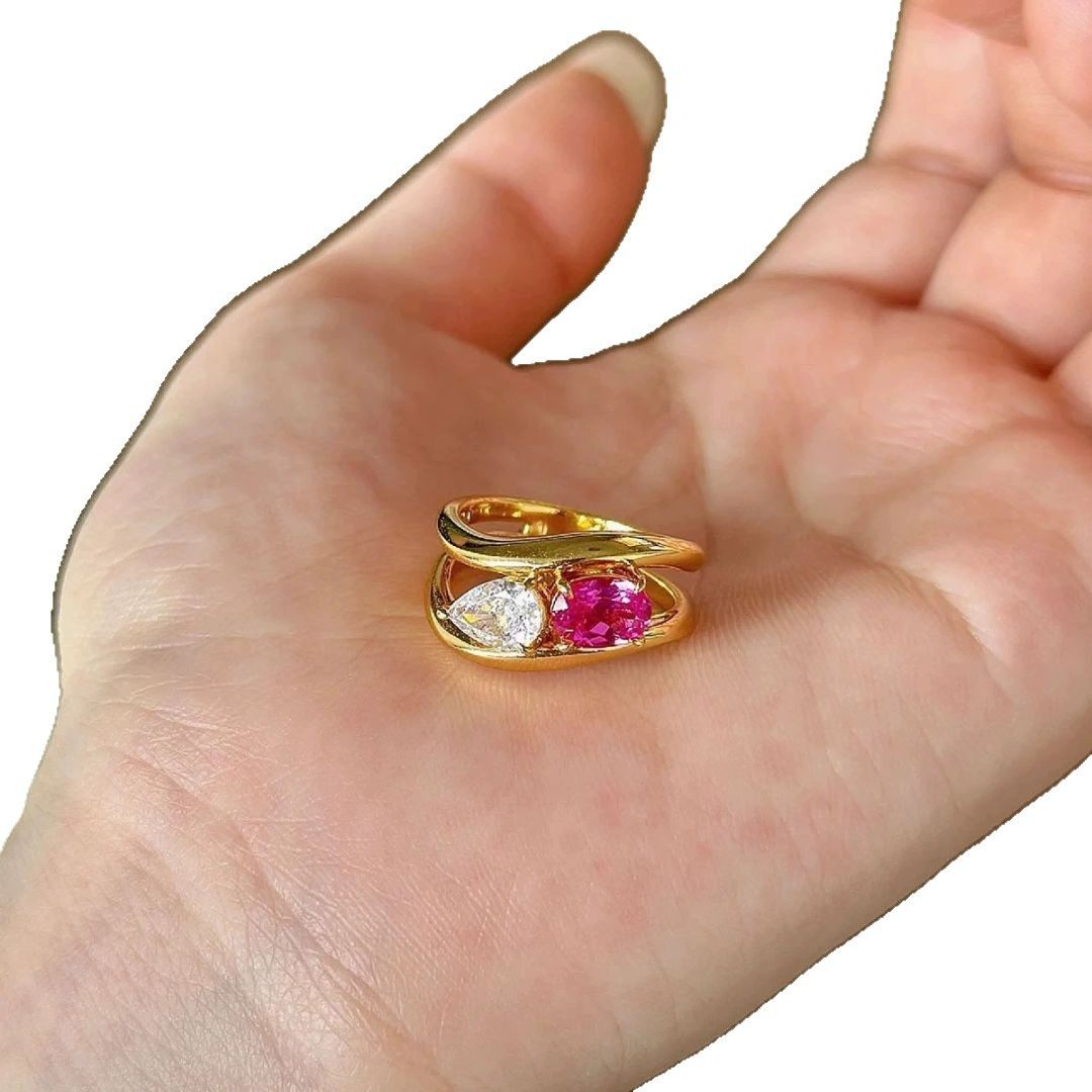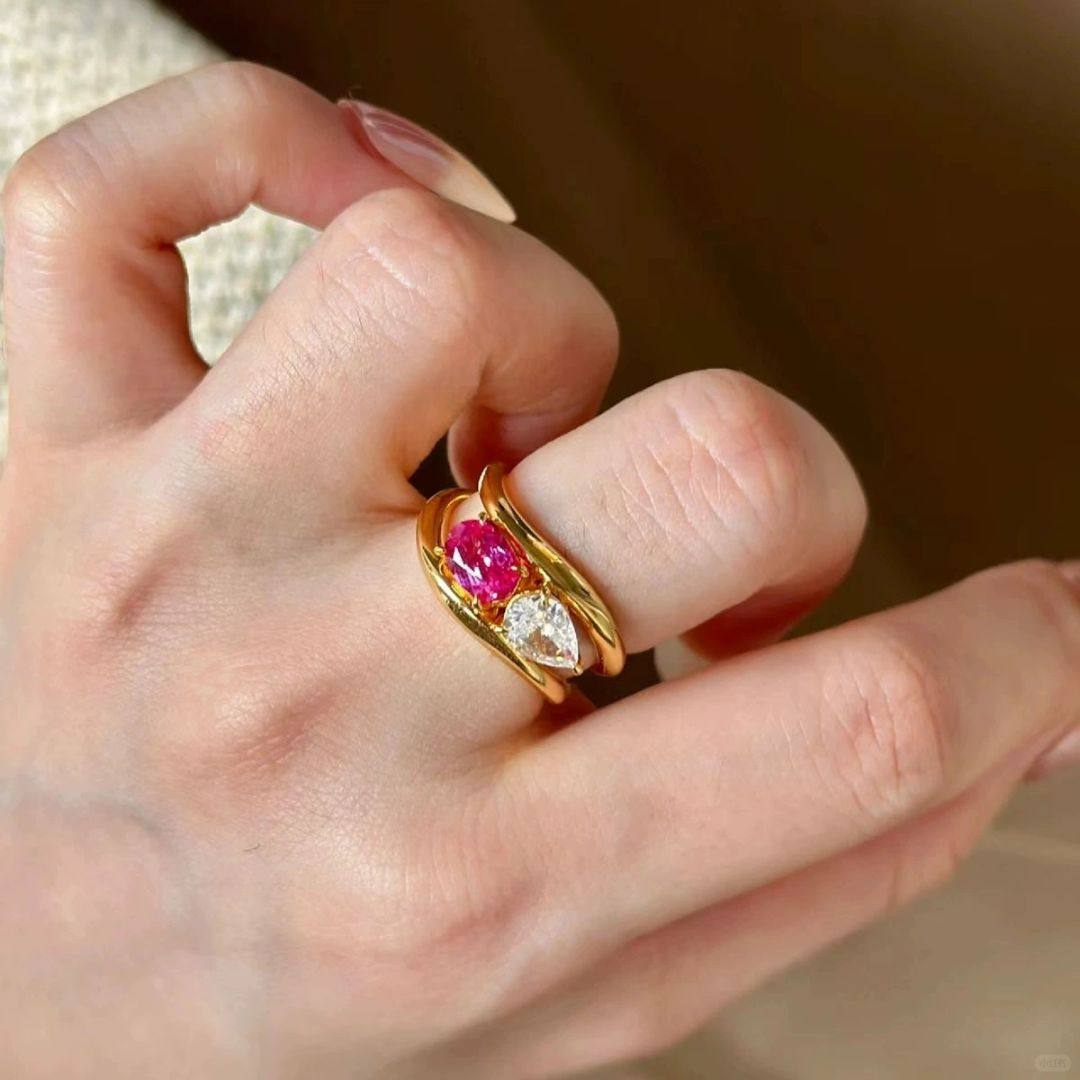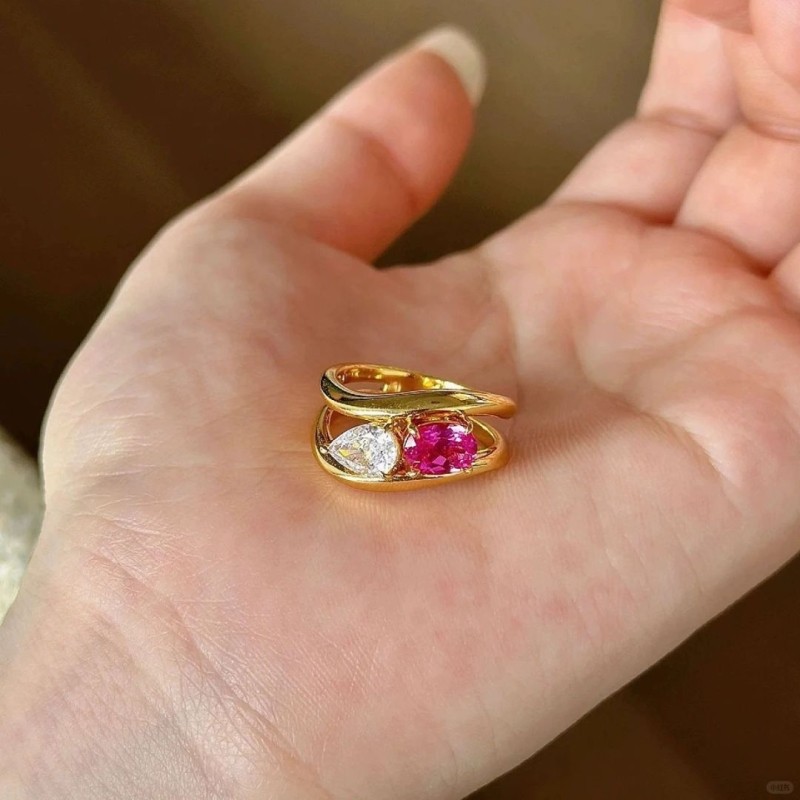 波浪红刚玉双色彩钻开口戒指女金色小众指环时尚轻奢高级感ins风