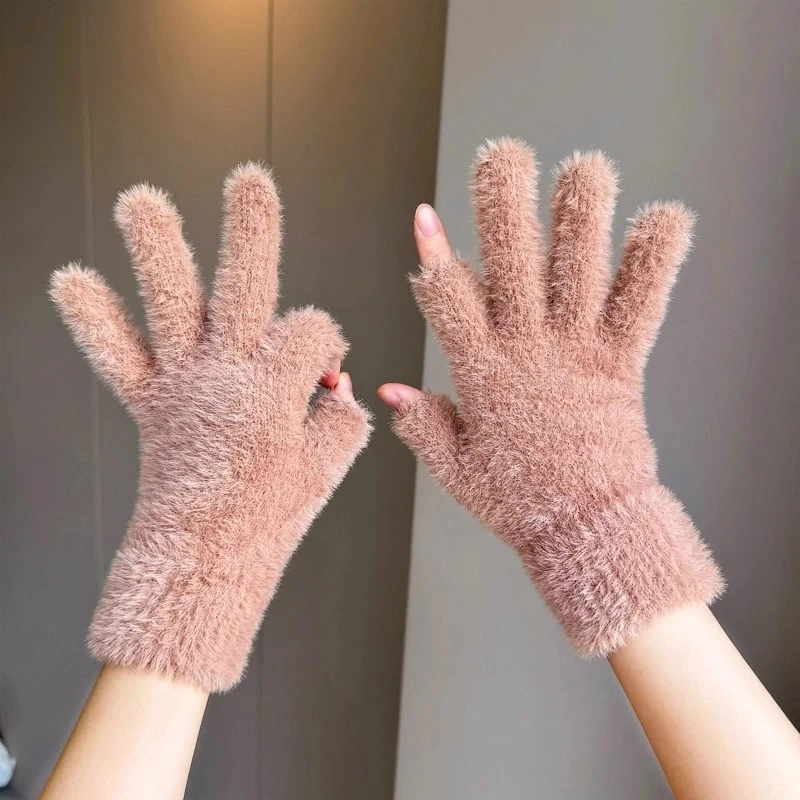 手套露二指冬季保暖触屏加绒半指可爱毛绒防寒漏指学生骑车防风