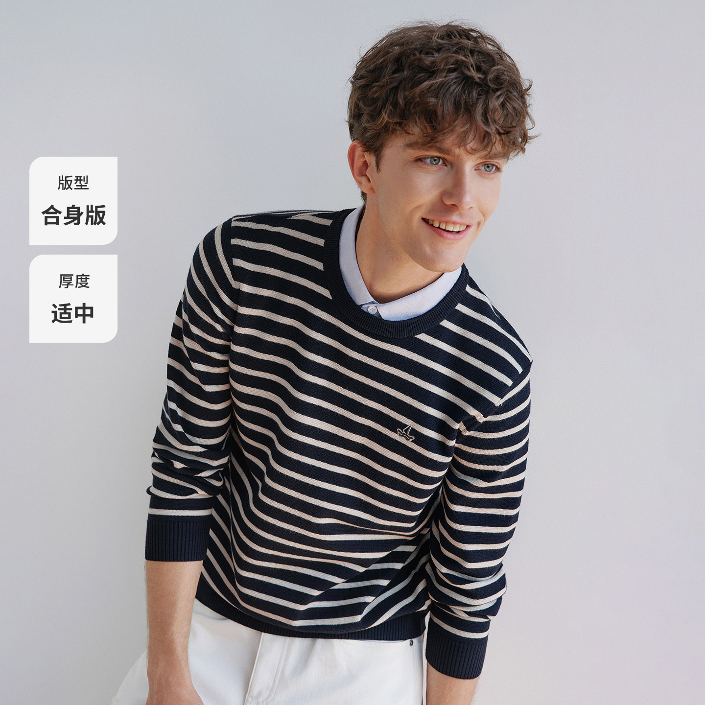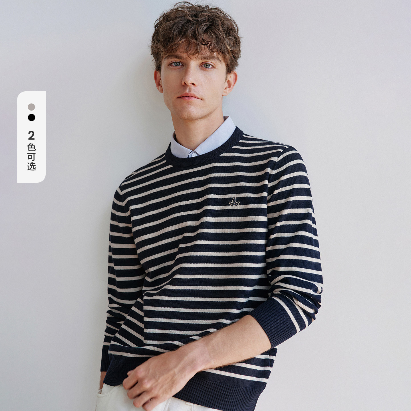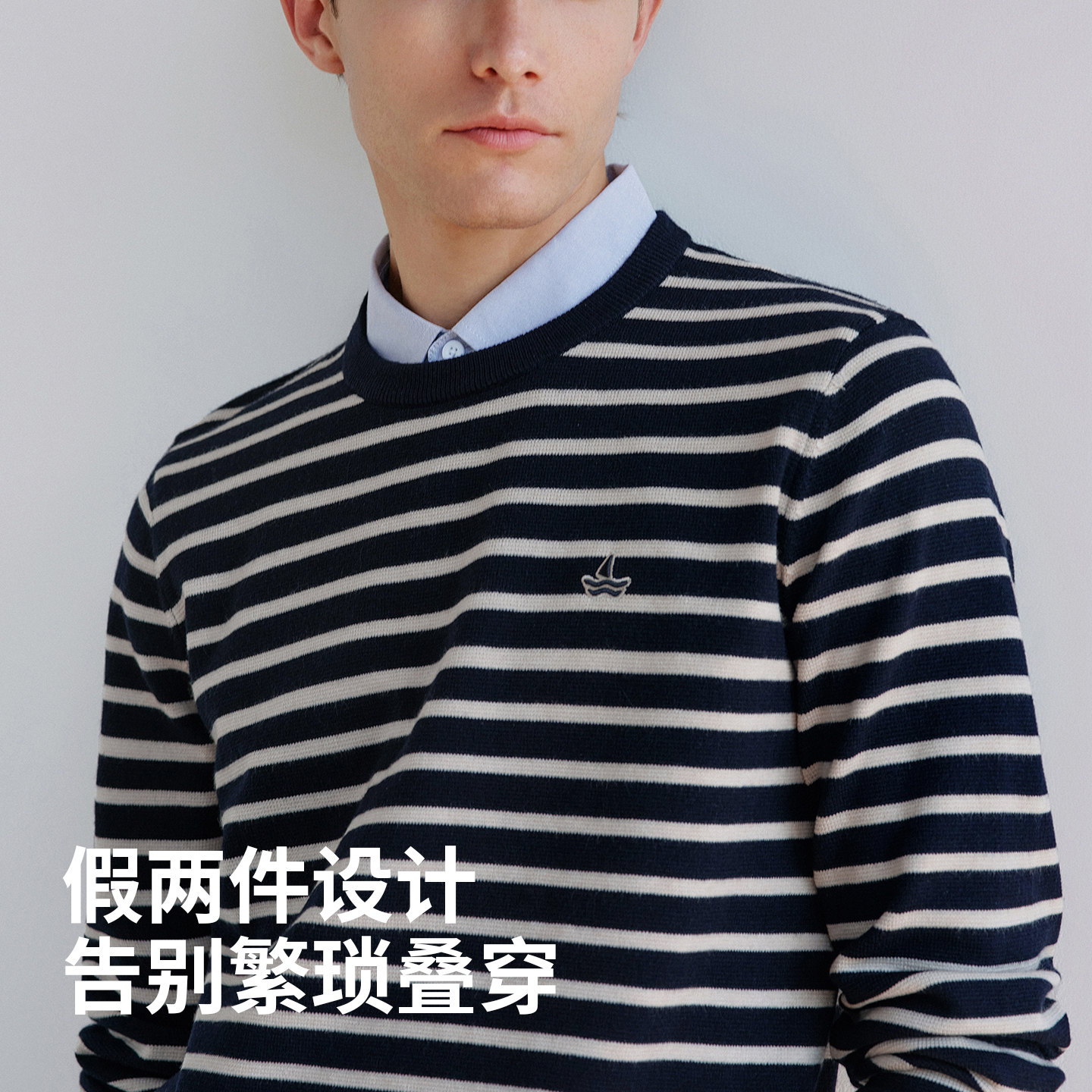 Navigare意大利小帆船长袖条纹针织衫男春秋新款衬衫领假两件毛衣