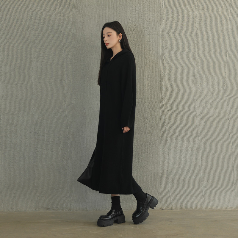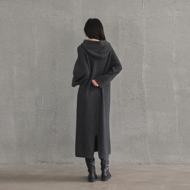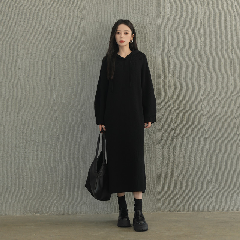 AIRIQI冬季新款慵懒风休闲连帽宽松直筒羊毛针织连衣裙AX44LQ318