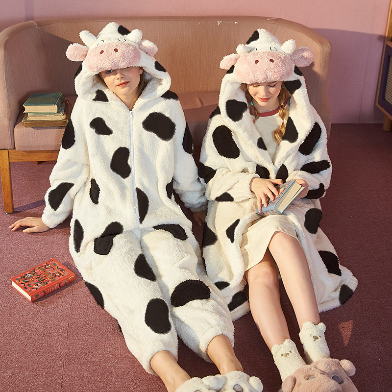 唐狮奶牛睡衣女冬长款连帽睡袍可爱连体睡衣裤厚可外穿家居服晨袍