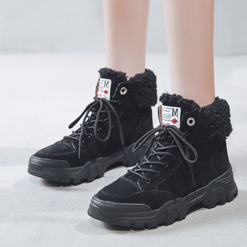 miu家厚底雪地靴女冬季真皮短靴羊毛侧拉链增高厚底加绒毛毛棉鞋