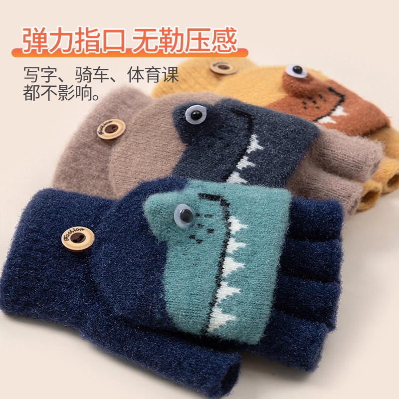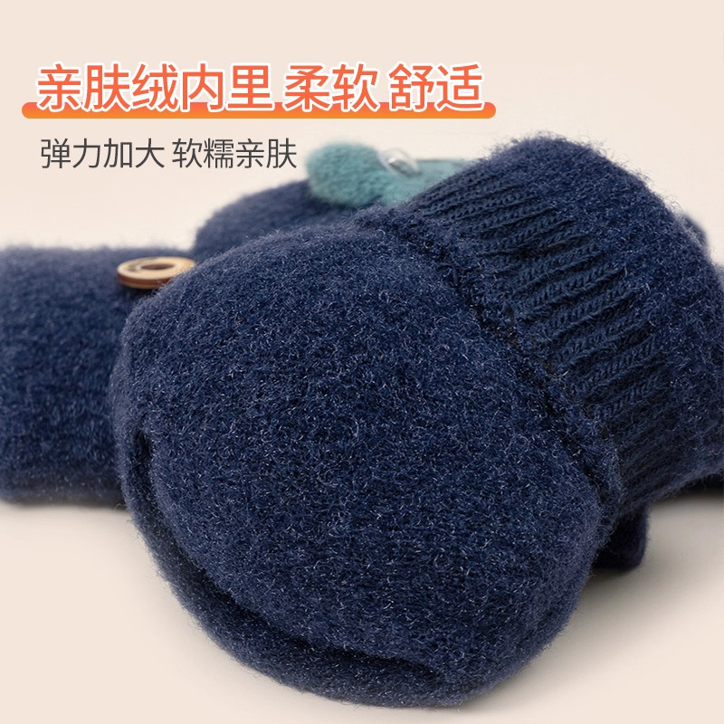 男女童手套秋冬保暖小学生写字露指加厚防风毛线翻盖五指可爱手套