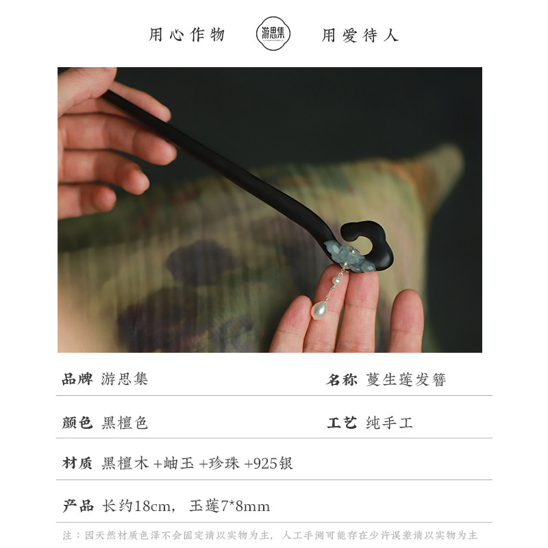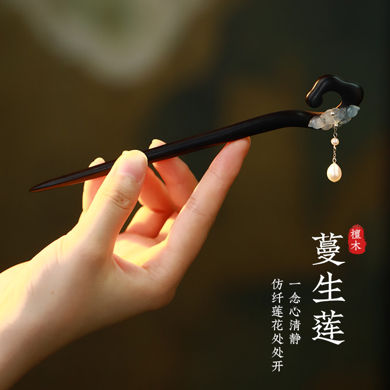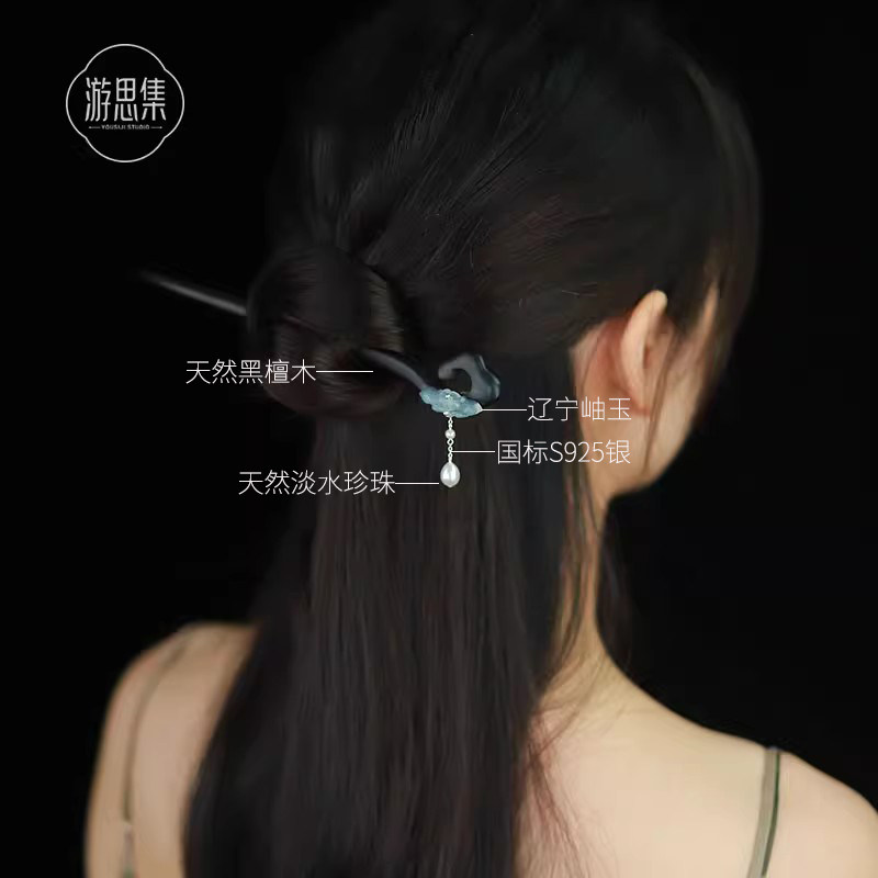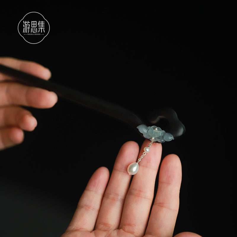 天然玉石黑檀木珍珠发簪女新中式古风步摇流苏簪子七夕节送礼发钗