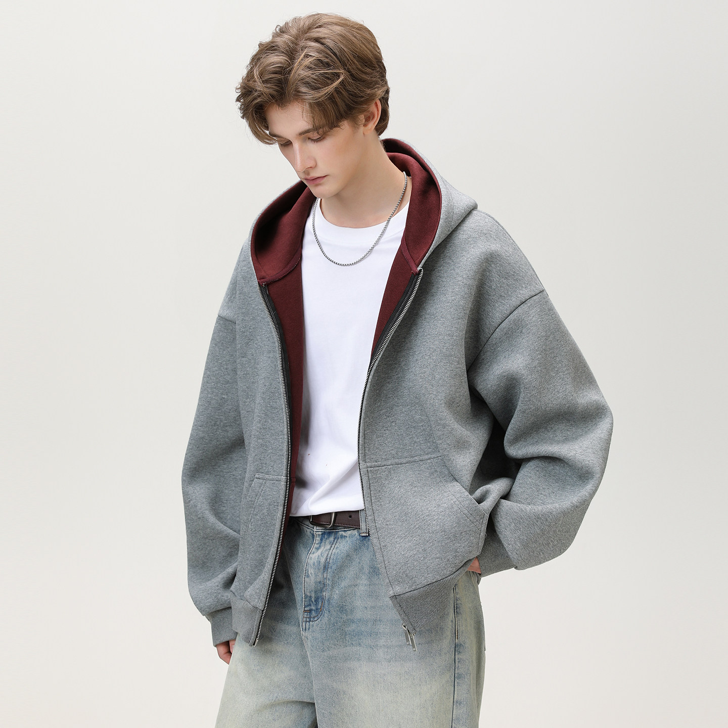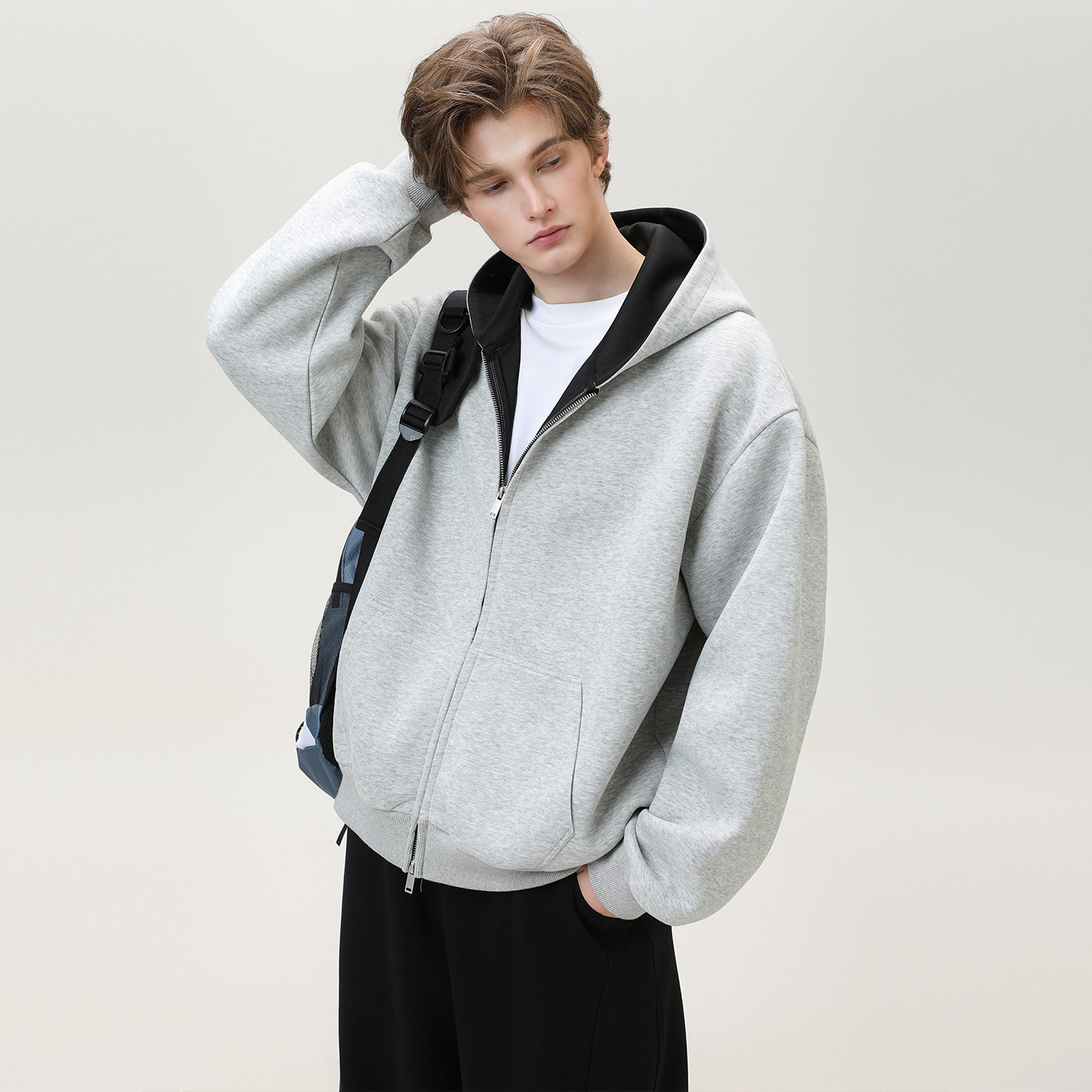 OFF-UP 美式重磅开衫连帽卫衣秋冬情侣款撞色短宽廓形开衫上衣