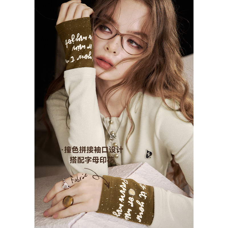 妖精的口袋撞色拼接字母印花长袖t恤女2025年秋冬新款内搭打底衫