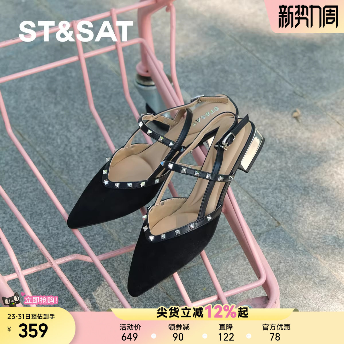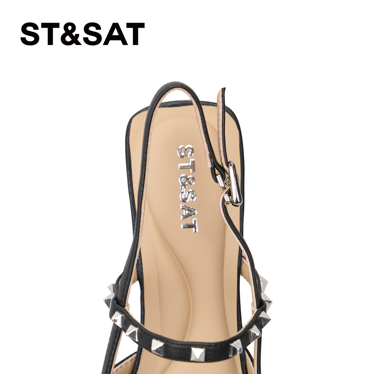 高级感羊皮星期六夏季气质包头凉鞋女尖头气质铆钉配裙子一字带鞋