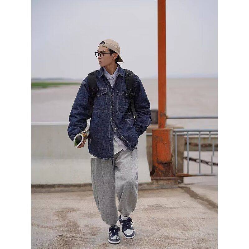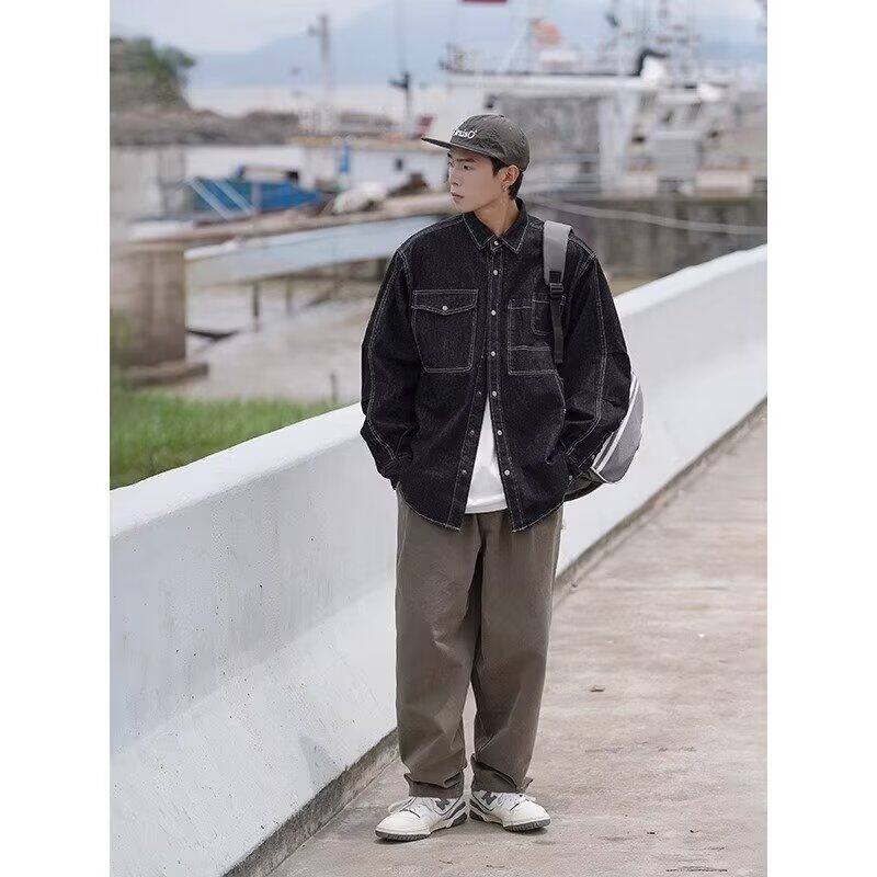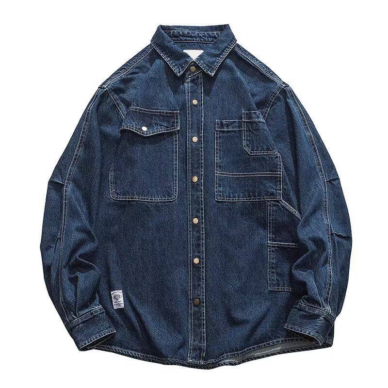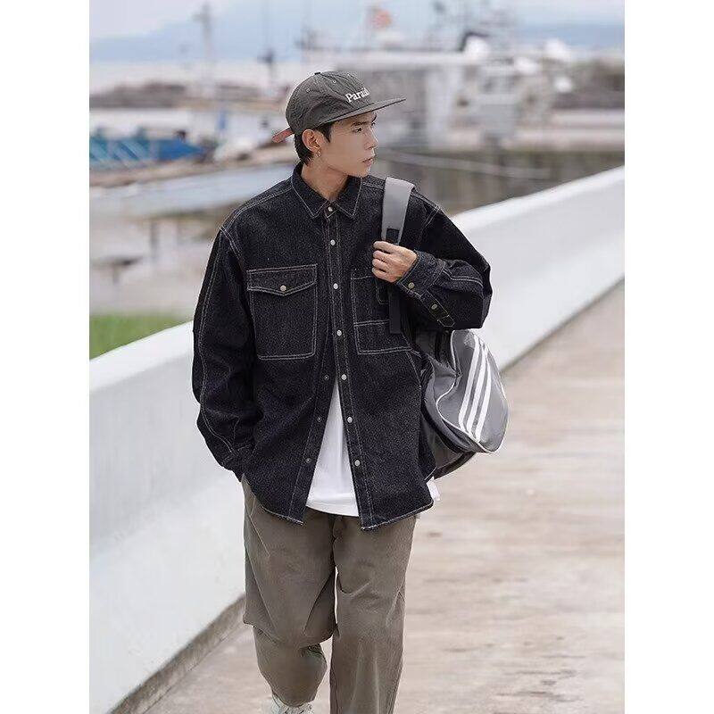 日系复古简约水洗蓝牛仔外套男士春秋潮牌设计感宽松夹克牛仔衬衫