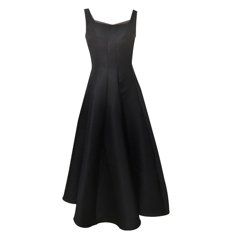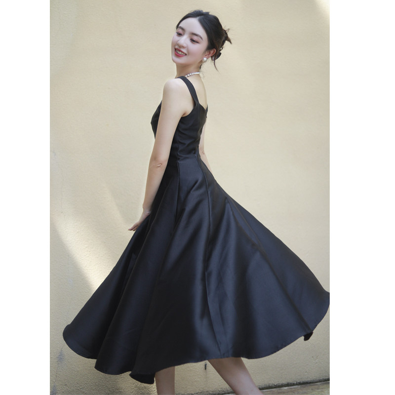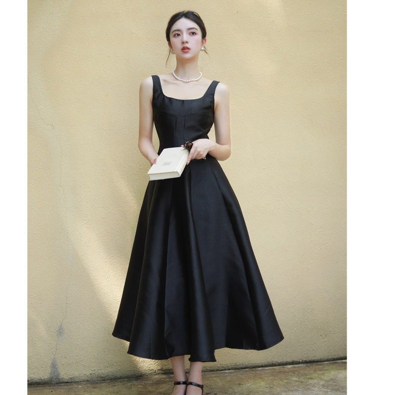 JUJU法式赫本风气质长裙收腰质感连衣裙高级感黑色醋酸缎面吊带裙