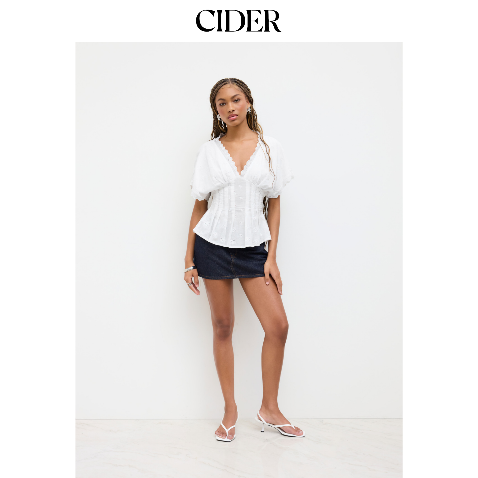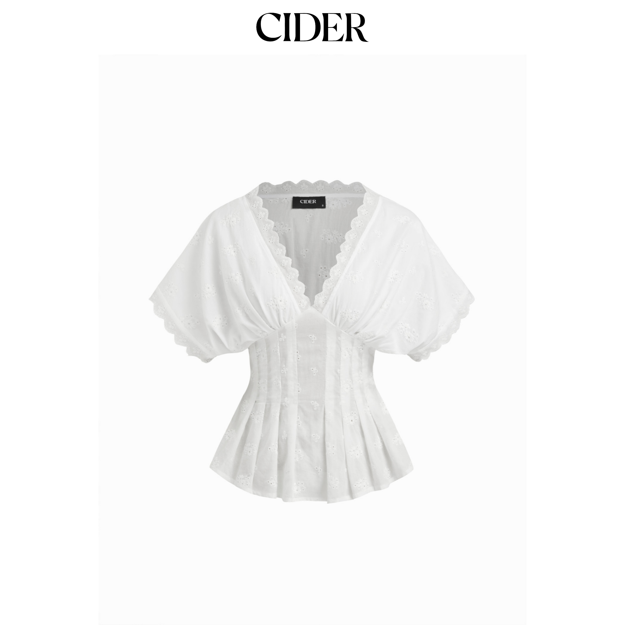 CIDER 棉质V领英式刺绣短款短袖百褶衬衫 女装114745091